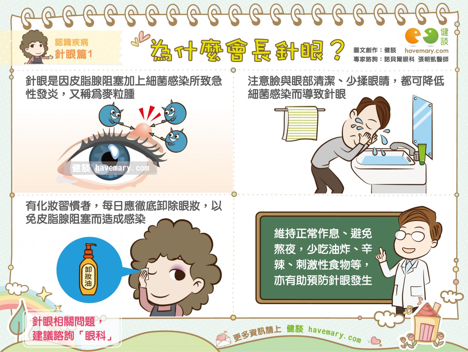 針眼是眼科很常見的問題之一,而坊間常聽到「偷看別人洗澡會長針眼」的說法其實是一句玩笑話,到底為什麼會長針眼呢?諾貝爾眼科張朝凱醫師表示,針眼其實是因為眼部皮脂腺阻塞加上細菌感染所致,只要對症治療約2至3天即可大幅改善。
