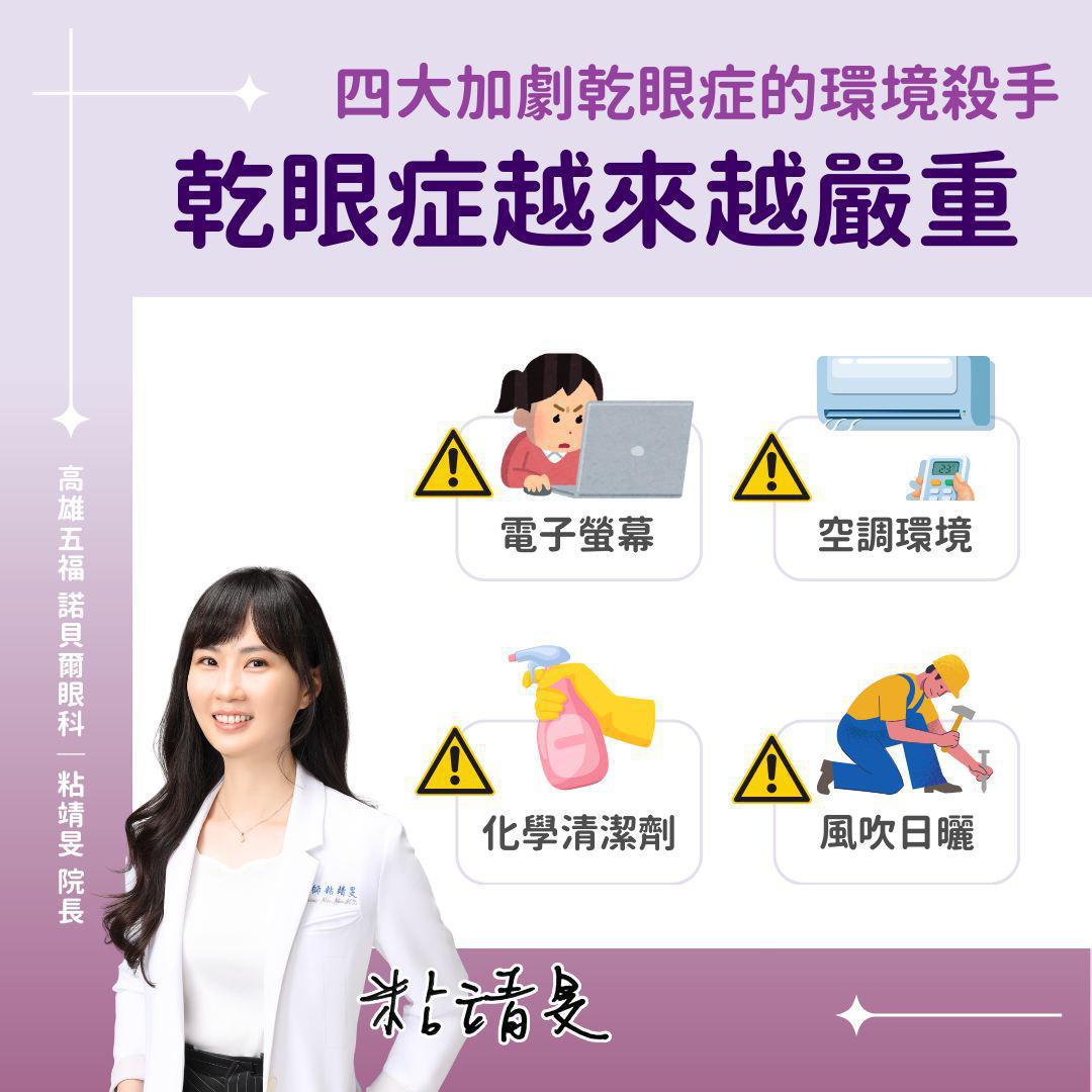 〔健康頻道/綜合報導〕不少人為眼睛乾、澀、痛感到困擾,甚至有人出現灼熱感和持續性的疲勞感而就醫。高雄五福諾貝爾眼科診所院長粘靖旻在臉書「粘靖旻眼科女醫師 高雄諾貝爾 屏東 東港」指出,恐怕是長期處在「乾眼症加劇區」而不自知!
