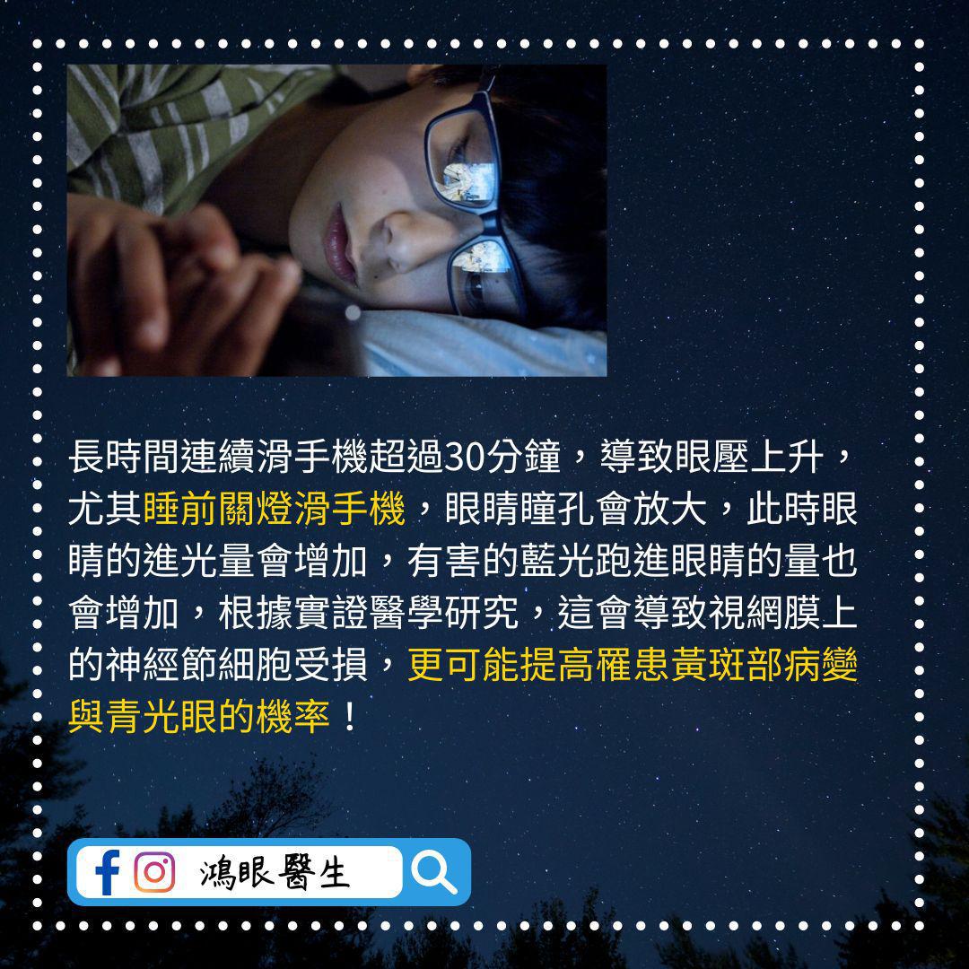他表示,長時間連續滑手機超過30分鐘,會導致眼壓上升,尤其睡前關燈滑手機,眼睛瞳孔會放大,此時眼睛的進光量會增加,有害的手機藍光進入眼睛的量也隨之增加。根據實證醫學研究,這會導致視網膜上的神經節細胞受損,更可能提高罹患黃斑部病變、青光眼的機率。
