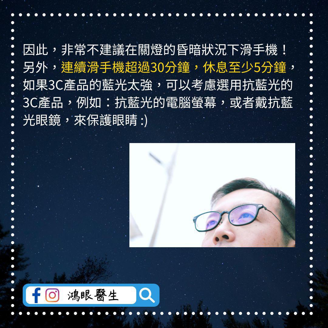 他因此提醒,民眾千萬別在關燈的昏暗狀況下滑手機。此外,連續滑手機超過30分鐘,必須休息至少5分鐘,若3C產品的藍光太強,可以考慮選用抗藍光的3C產品,例如抗藍光的電腦螢幕,或佩戴抗藍光眼鏡,來保護眼睛。