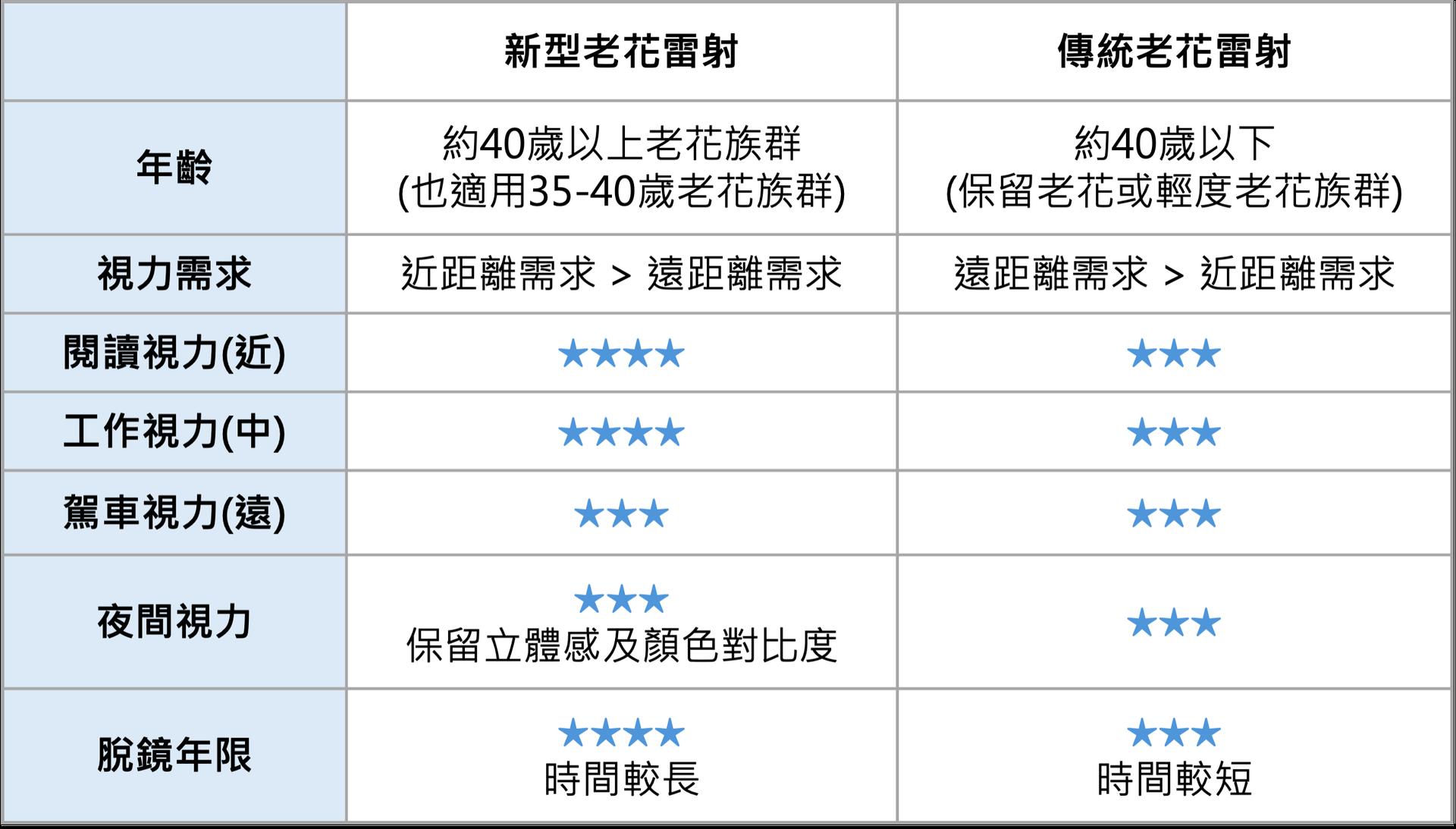 ▲「新型老花雷射」與「傳統老花雷射」選擇參考指標。