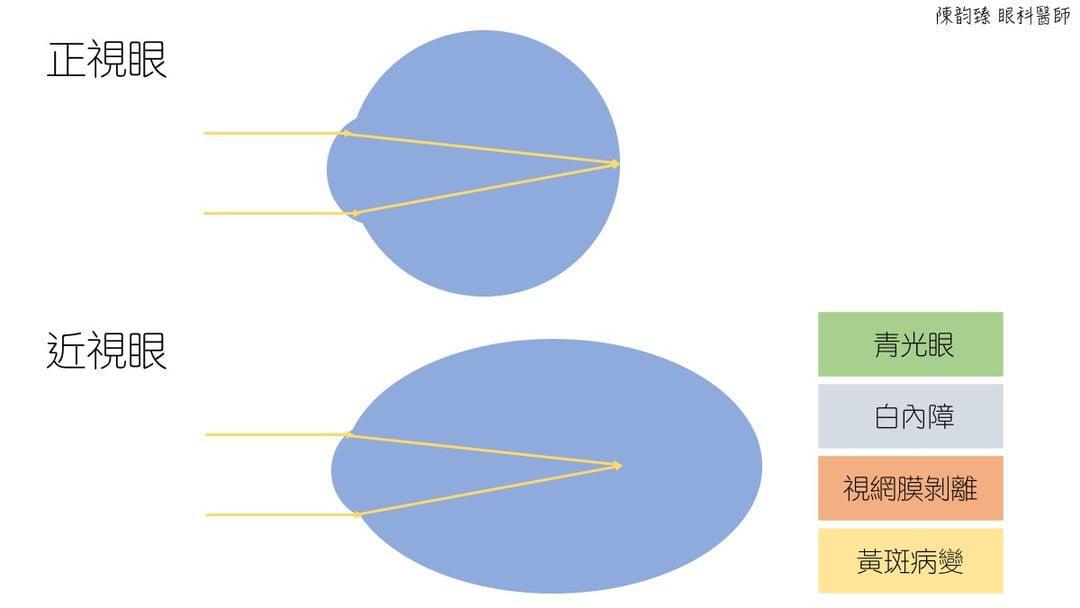 大多數兒童的近視主要是因為眼軸增過長變形,造成光線落在是網膜前,而使我們無法看清楚影像。眼軸持續增長,會使眼球壁組織以及視網膜會變薄,組織變得加脆弱,因此產生許多併發症。