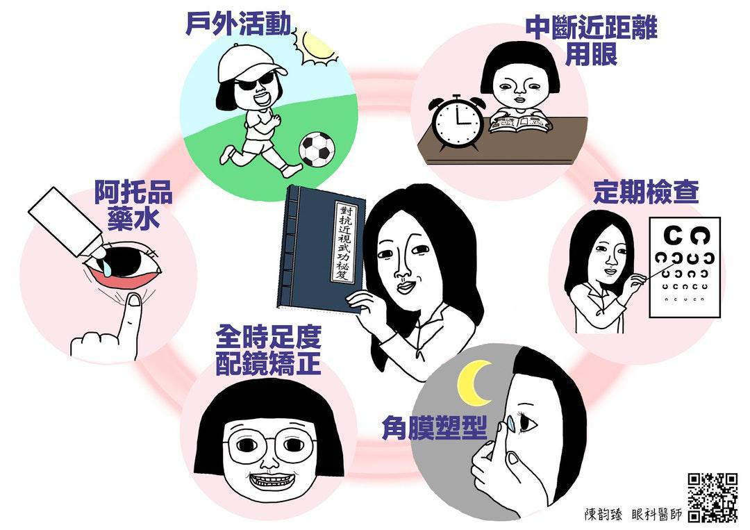 由以上數據可知,愈早產生近視,將來變成高度近視的機會也就愈大。因此在治療近視方面,第一要先預防近視的發生。但若發現已經產生了近視,就要想辦法降低近視的進展的速度。對抗近視可以從每天的生活習慣做起,並且積極密切配合眼科醫師的治療,達到事半功倍的效果。
