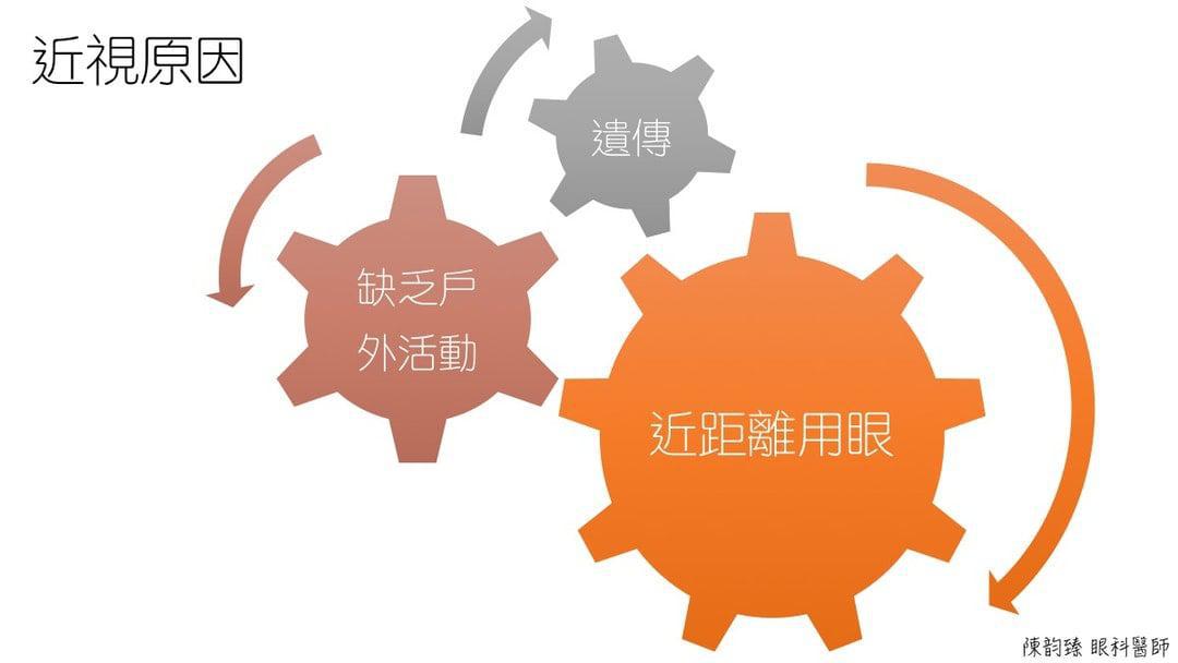 近視的成因很複雜,包括基因、生活習慣和環境等各種因素。近視雖然跟基因有關,但是環境因素更重要。環境因素目前確定會影響近視的有兩個: