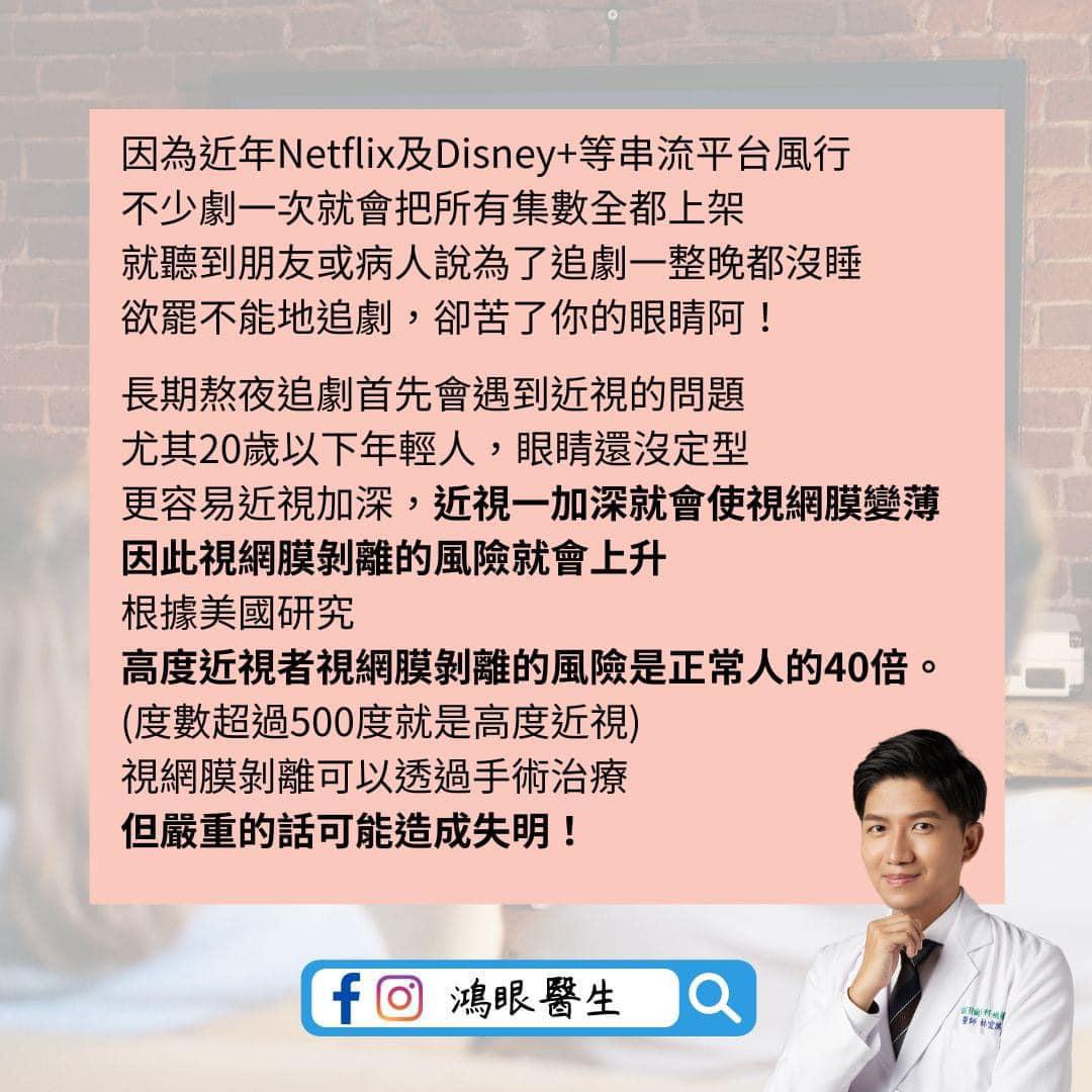 林宜鴻在臉書專頁「鴻眼醫生|林宜鴻眼科醫師」發文表示,長期熬夜追劇首先會遇到近視的問題,尤其是對於眼睛尚未定型的20歲以下年輕人,更容易近視加深,近視一加深就會使視網膜變薄,因此會上升視網膜剝離風險。