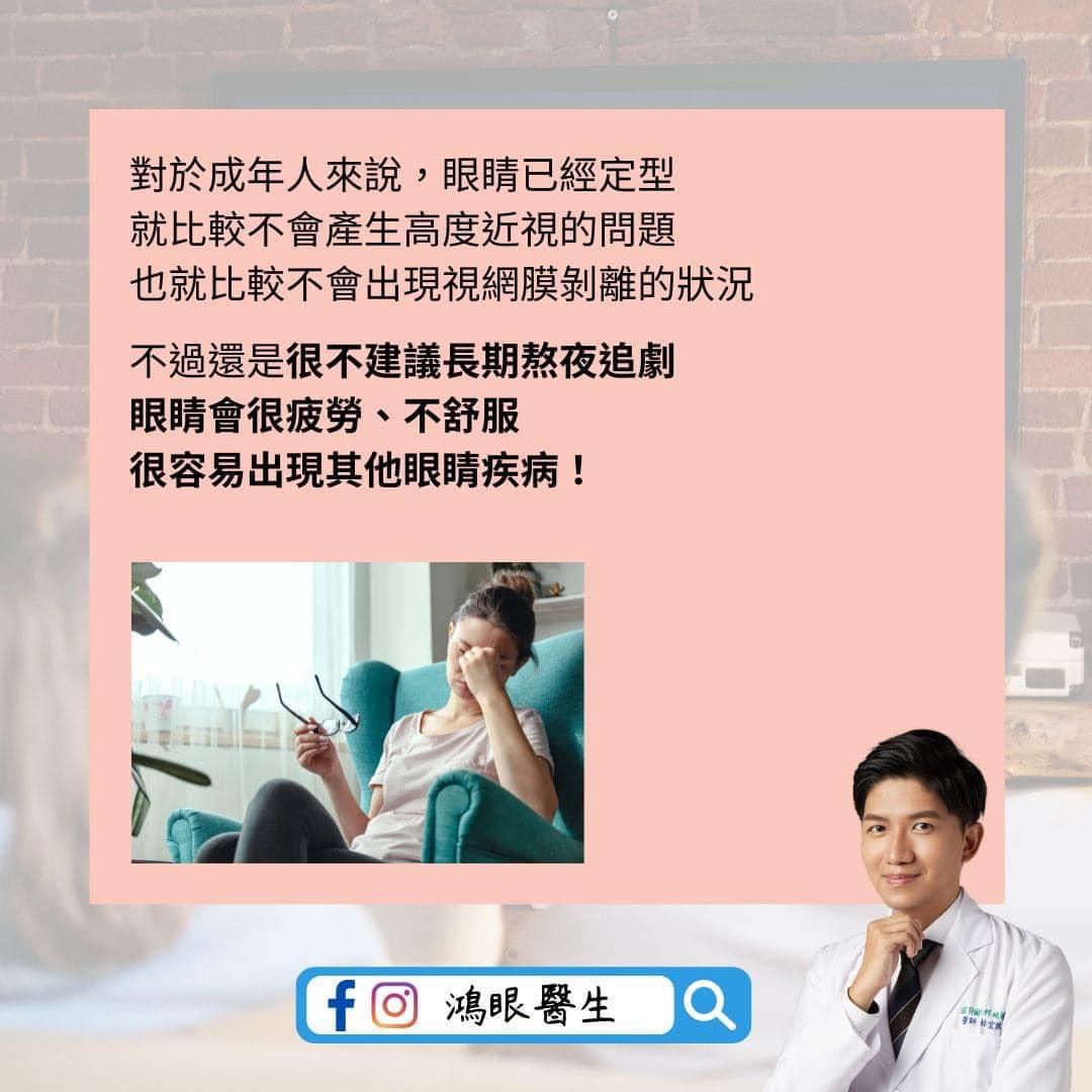 林宜鴻強調,即便成年人眼睛已經定型,比較不會產生高度近視的問題,也比較不會出現視網膜剝離的狀況,但仍不建議長期熬夜追劇,因為欲罷不能追劇會讓眼睛疲勞、不舒服,更容易出現其他眼睛疾病。
