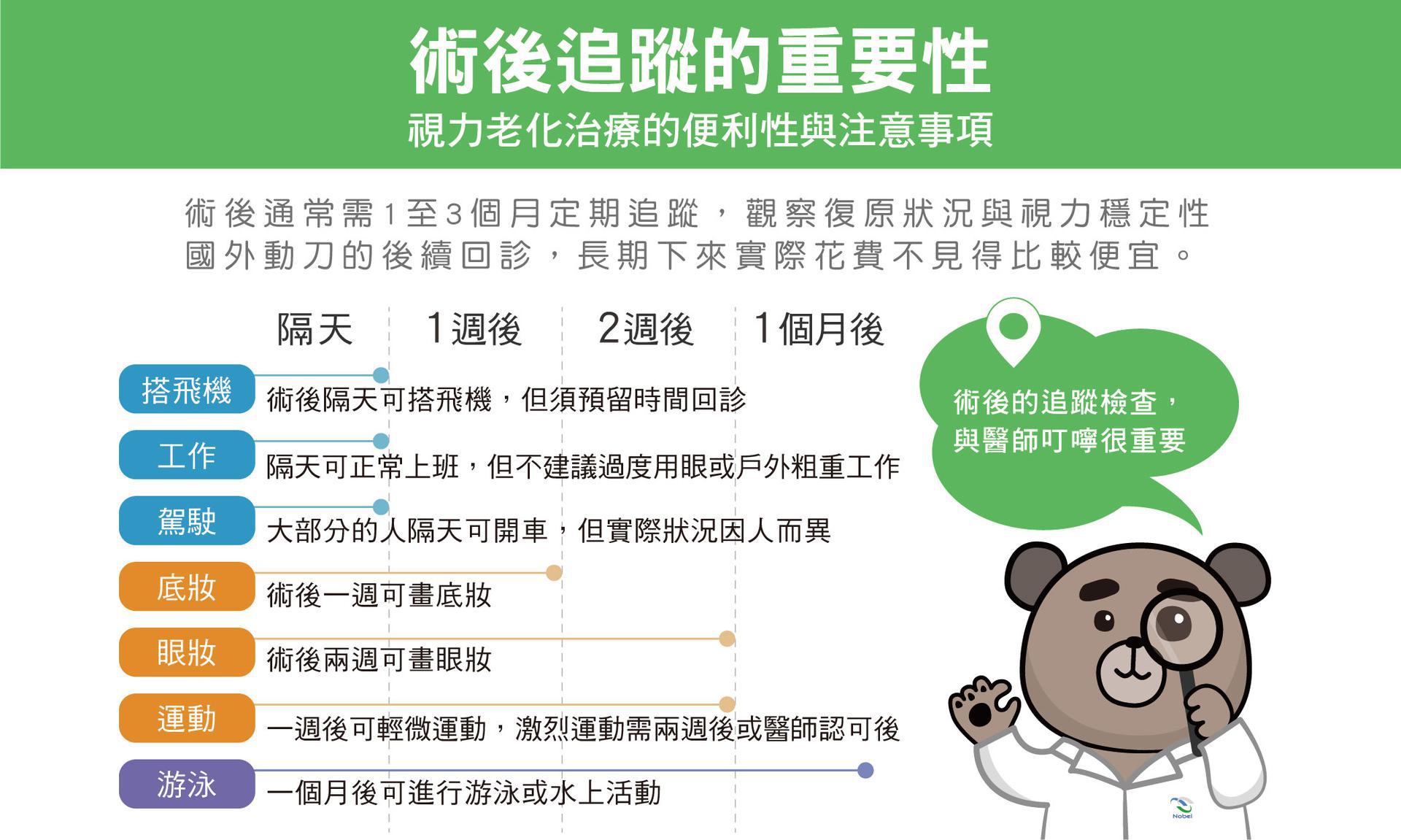 此外,近視雷射術後通常需1至3個月定期追蹤,觀察角膜復原與視力穩定性,才能及早處理乾眼、視力不穩定等暫時性恢復及適應問題。若人在國外動刀,後續回診恐需反覆出國,每趟所費不貲,長期下來實際花費不見得比台灣便宜,反而更高。