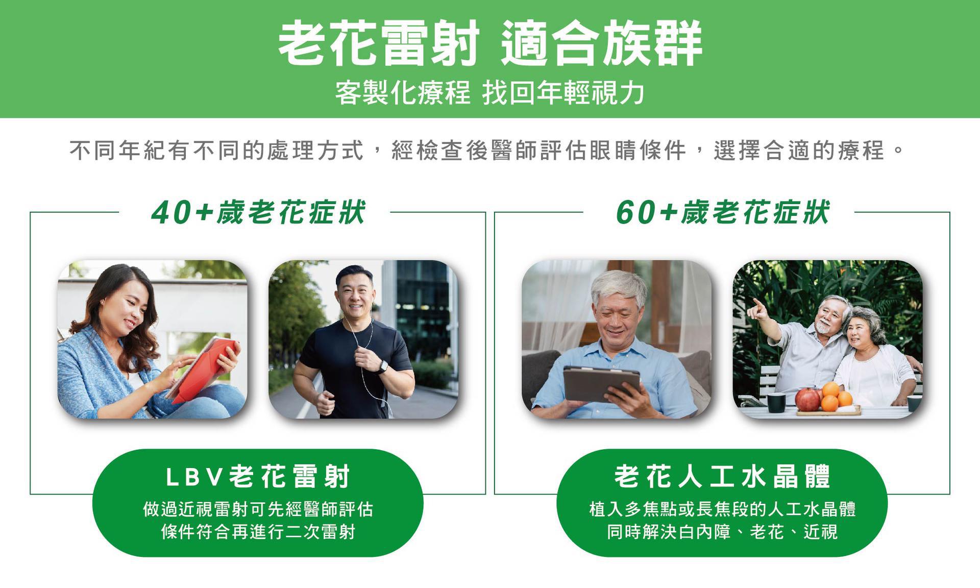 至於什麼樣的人適合進行LBV老花雷射?如果做了LBV老花雷射,日後若需要做白內障手術,會有影響嗎?羅醫師說明,不同年紀有不同的處理方式,LBV老花雷射是眼球表面的雷射,恢復快速,安全性高,適合40-60歲的族群,即使過去曾做過近視雷射,經醫師評估角膜厚度和眼睛條件後,也可能再進行二次雷射。而60歲以上長者, 建議在治療白內障時,植入多焦點或長焦段的人工水晶體,同時解決白內障、老花、近視等問題。