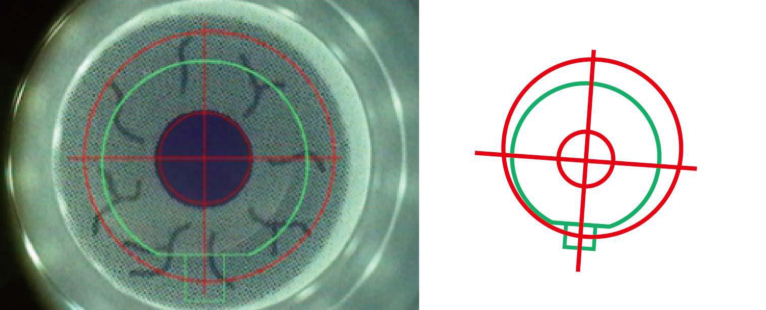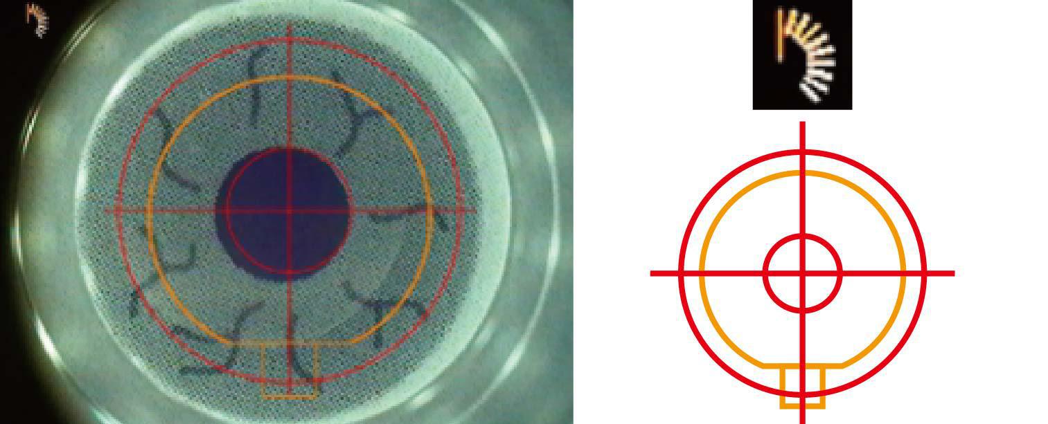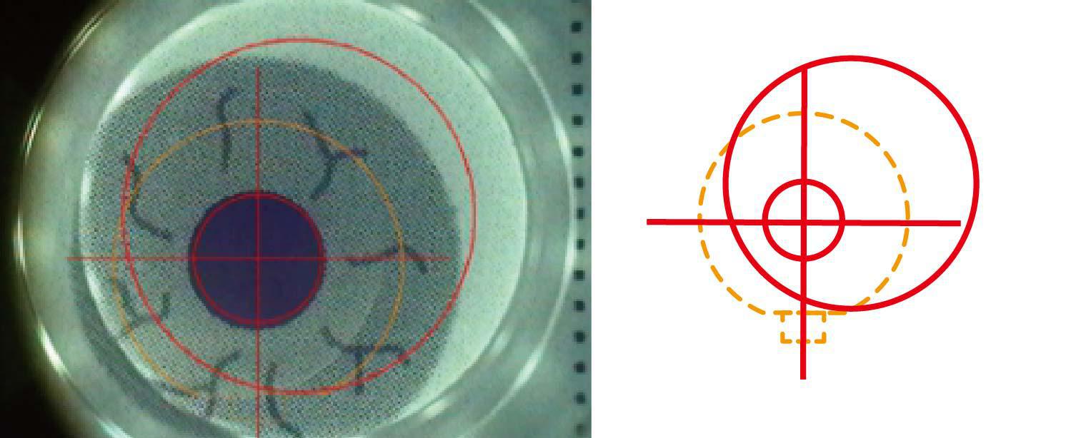 已偵測到的虹膜定位後的畫面,可根據個人虹膜特徵自動定位眼球自旋角度並進行瞳孔追蹤定位製瓣。