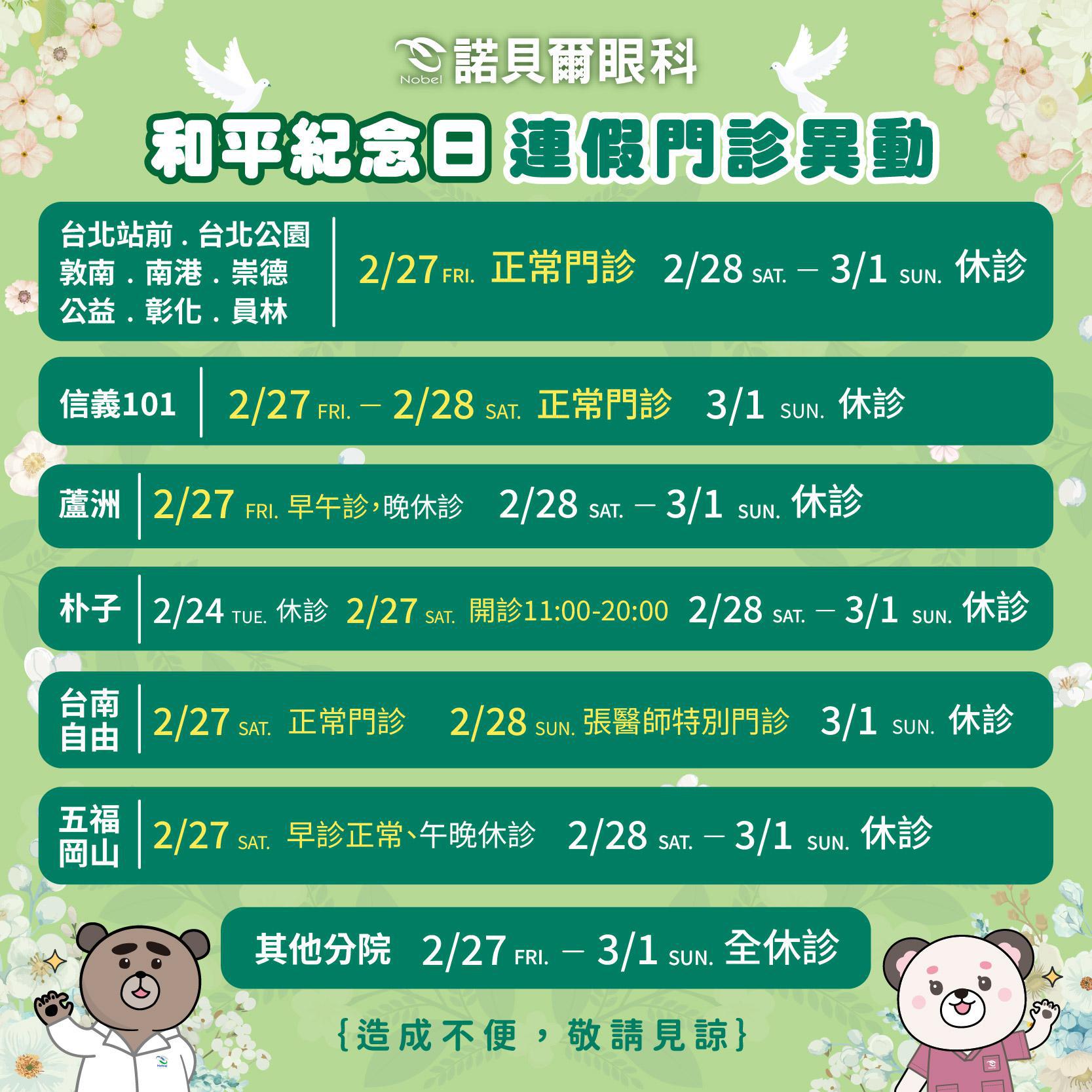 過年如需至 #諾貝爾眼科 看診或手術的朋友們~
