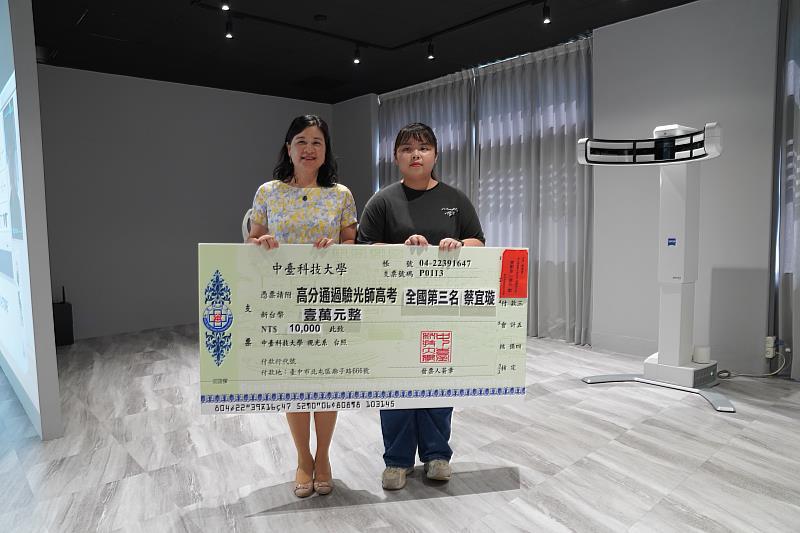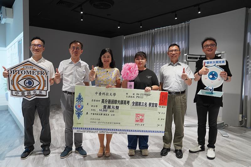 此外,中臺科大視光系蔡宜璇同學參加今(112)年驗光師高考,榮獲第三名成績,表現優異!蔡同學表示,在求學過程中感謝老師的教導,給予許多專業知識與技術,並提供實作經驗的機會,讓自己能夠在高考中靈活運用基本觀念。中臺科大陳錦杏校長特別頒發獎學金,期勉同學在學習專業技術的同時,要將理論知識打好基礎,努力考取證照,為未來就業與社會做無限的耕耘。