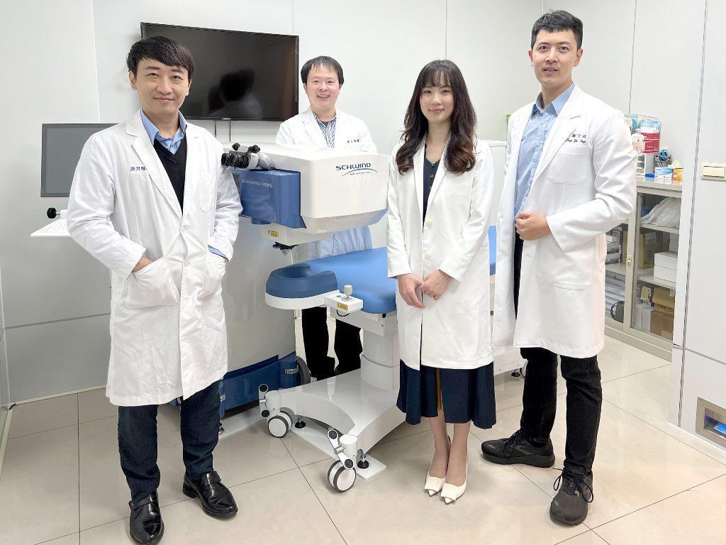 ▴諾貝爾眼科機構醫療團隊(左起)林俊佑醫師、黃柏憲醫師、粘靖旻醫師、鄭宇庭醫師與高階微創飛秒雷射SMART Pro設備合影。