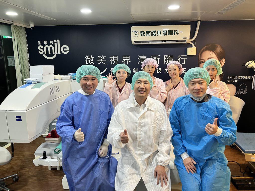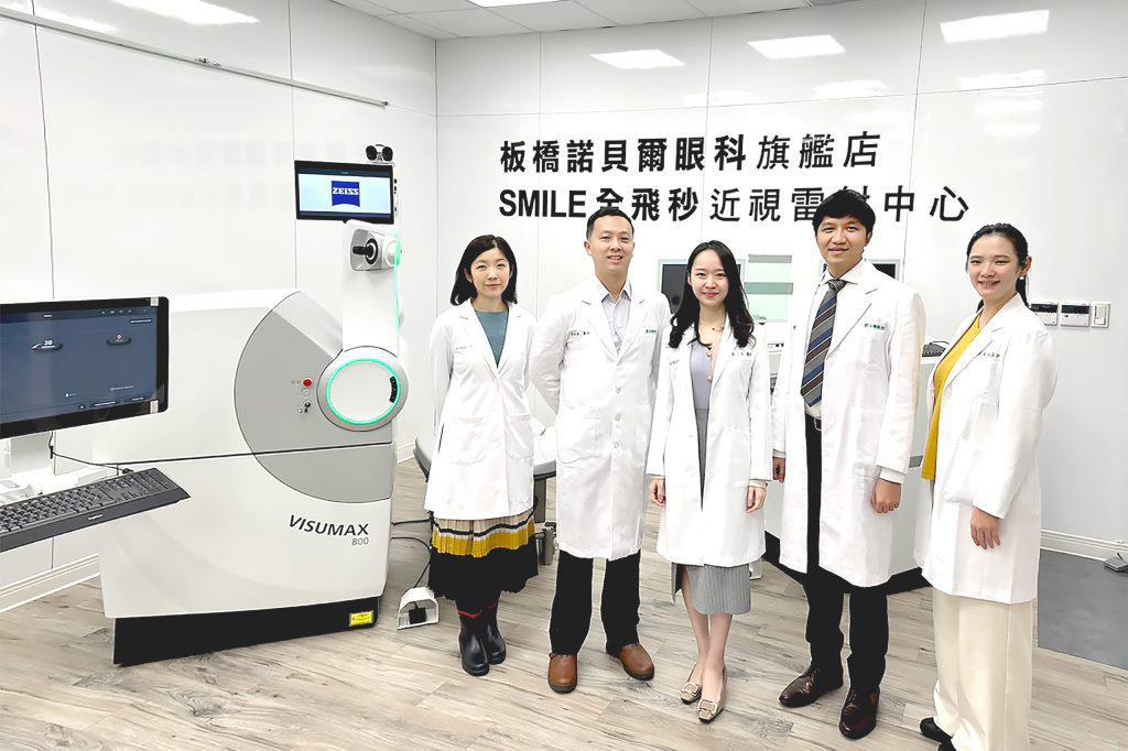 ▴諾貝爾眼科機構專業醫師群(左起)賴愈尹醫師、趙振程醫師、徐乙玉醫師、林宜鴻醫師、何奕瑢醫師與高階微創飛秒雷射SMILE Pro設備合影。