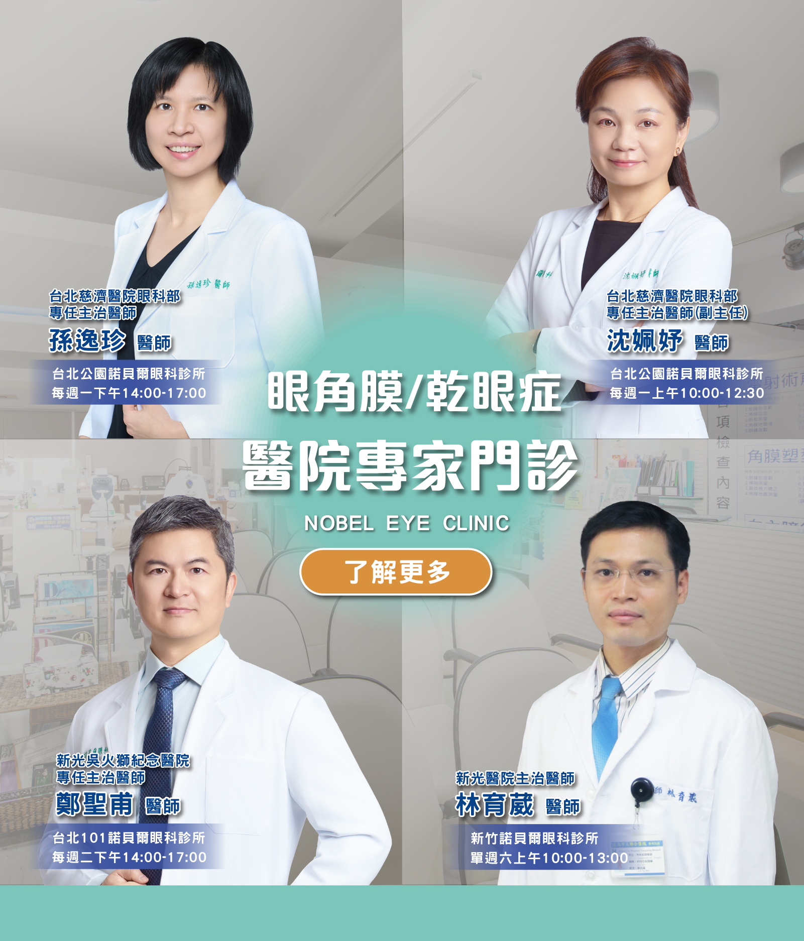 增設 「眼角膜暨白內障專家門診」,邀請到醫學中心眼科主治醫師,來諾貝爾眼科診所兼任專家門診主治醫師,服務民眾,這三位專家的資訊如下: