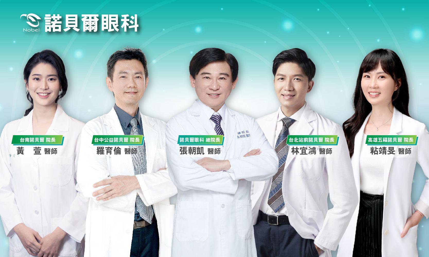 諾貝爾眼科專業醫師團隊,由左至右依序為黃萱醫師、羅育倫醫師、張朝凱醫師、林宜鴻醫師、粘靖旻醫師。諾貝爾眼科/提供