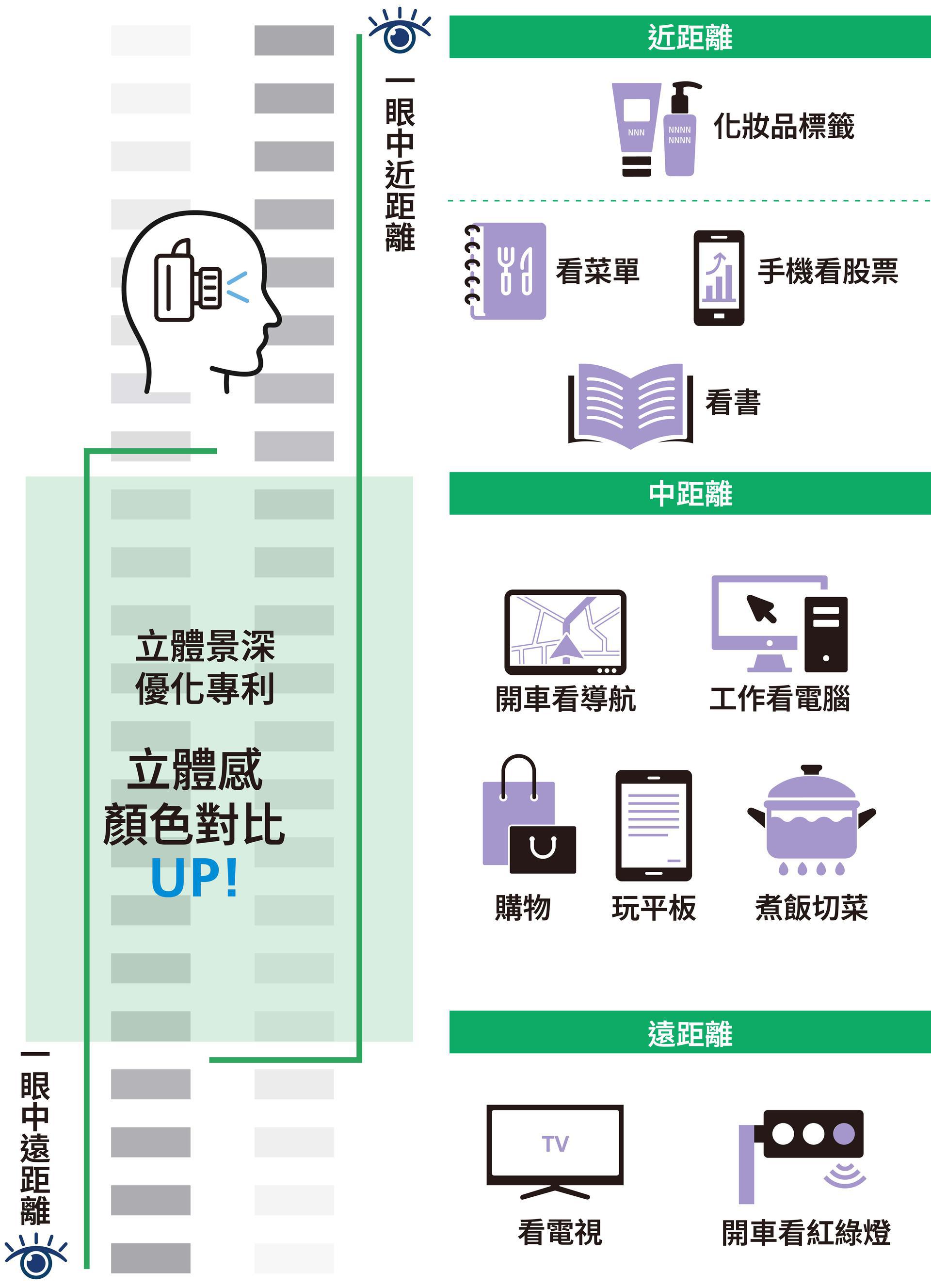 老花、近視、散光 皆可同時矯正,雙眼景深延長效果,遠、中、近視力都清晰,且具有雙眼融像區,容易適應視差。雙眼視差加上立體景深專利,達成多距離清晰視力。
