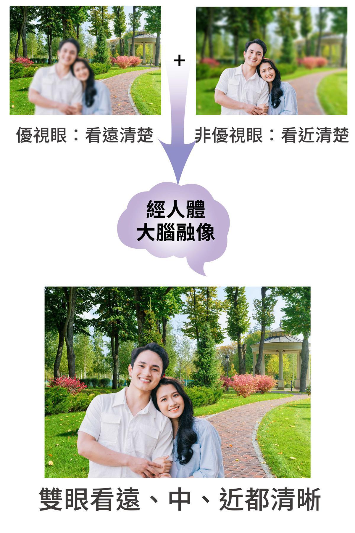 主導眼(主眼)中遠距離,非主導眼(副眼) 中近距離,輕微保留近視度數,利用雙眼協同視覺融合,實現遠、中、近全距離清晰視力。