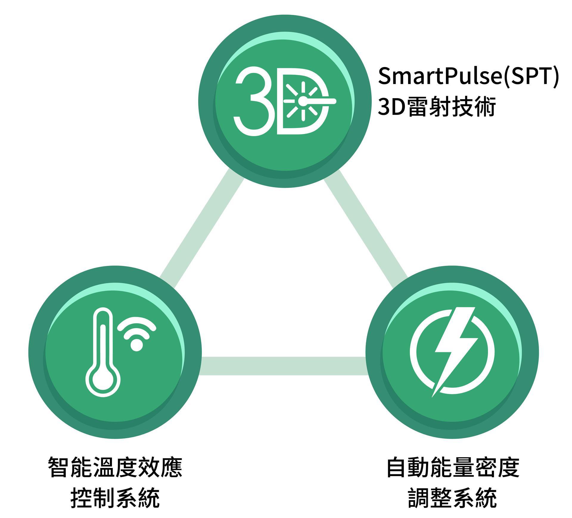 SmartPulse(SPT)為超先進的3D雷射技術,能完全符合角膜弧度。其雷射光束位置分布與傳統的2D方式相比,更為均勻,雷射脈衝間更加緊密,可使術後角膜更平滑,並縮短恢復期及有效提升視覺品質。