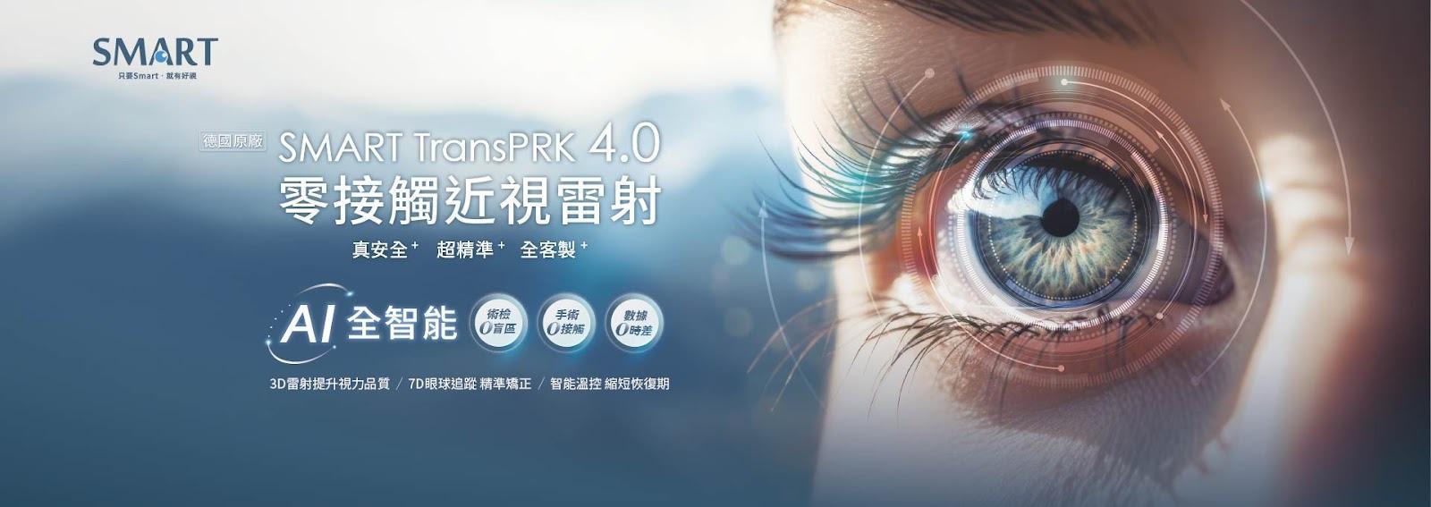 SMART TransPRK 是一種無掀瓣、溫和不接觸的近視雷射手術,搭載 7D動態眼球追蹤與 3D智慧脈衝(SMART Pulse)雷射,可根據角膜弧度與眼球動態,自動調整能量與角度。手術過程智慧控溫、防止過熱傷害,術後角膜平滑、恢復快速,視力穩定。