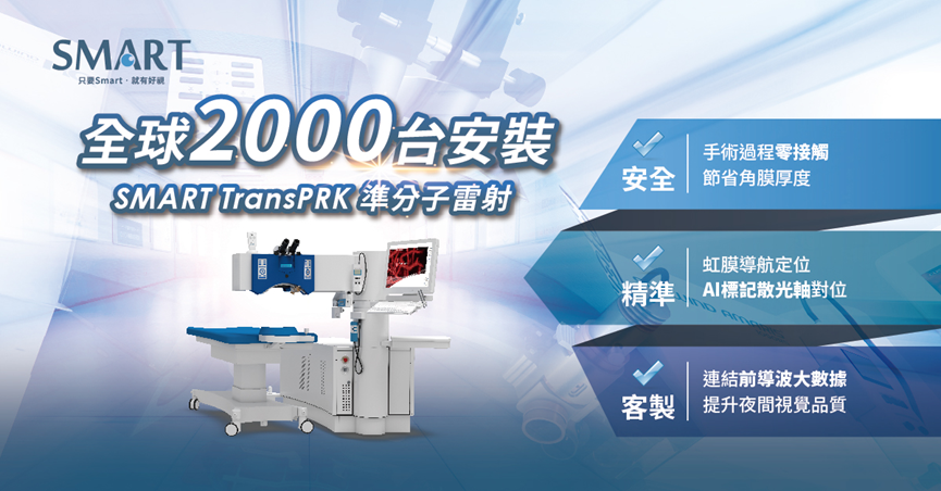Smart TransPRK全智能零接觸近視雷射手術是TransPRK的高階進化版,使用全球頂級的SCHWIND AMARIS系列準分子雷射儀,擁有獨特的SmartPulse技術。因手術全程使用準分子雷射、無需使用酒精浸泡角膜,能快速且精準地客製手術治療;無須掀開角膜瓣、安全性極佳。