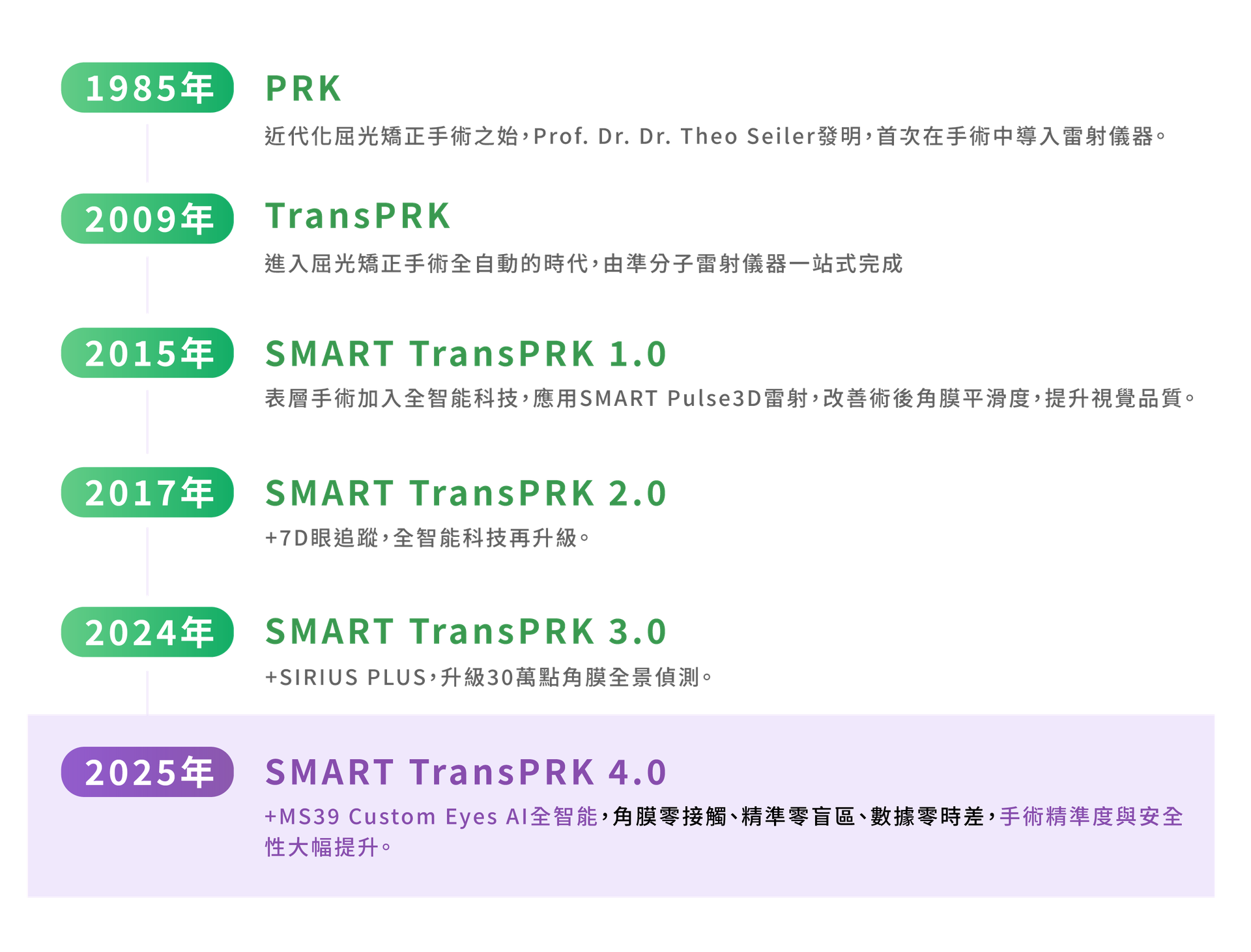 表層近視雷射手術自1985年問世以來,不斷追求更安全、精準、舒適的視覺矯正體驗。SMART TransPRK 準分子雷射以無刀、無接觸的優勢,在全球掀起新一代表層雷射手術浪潮,其技術演進如下: