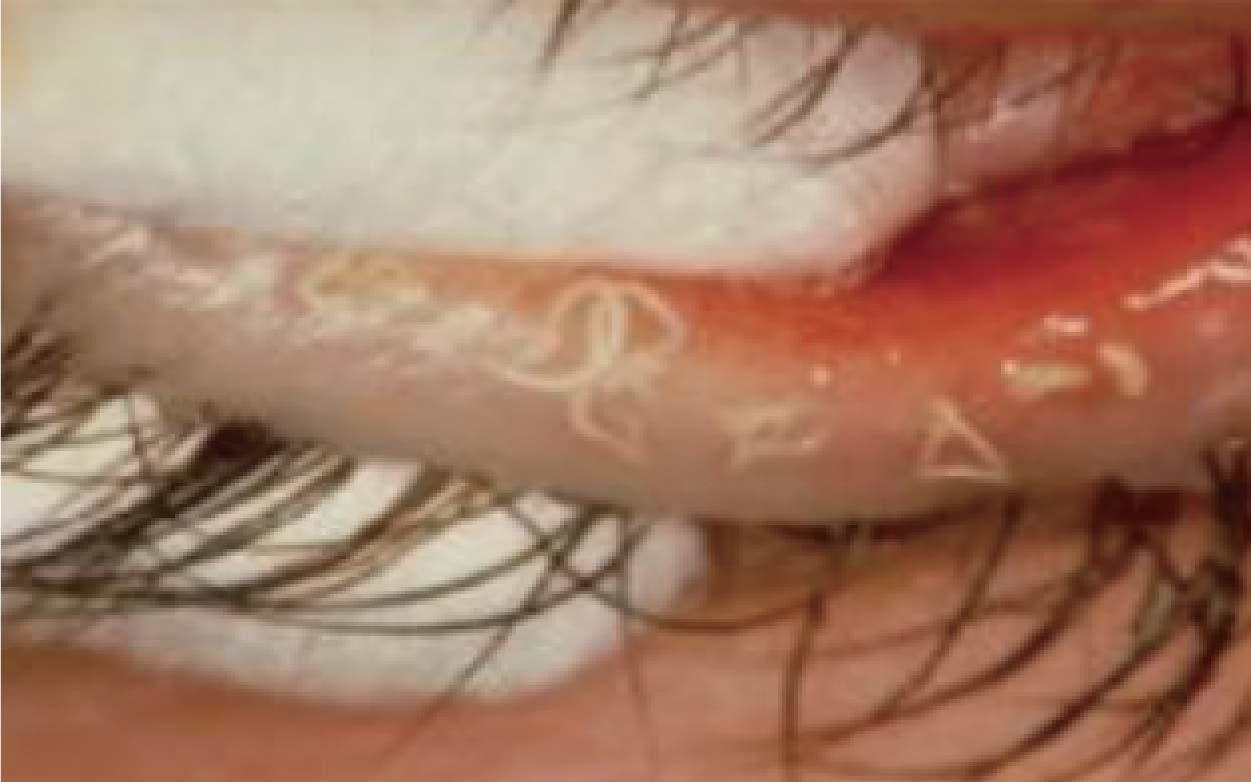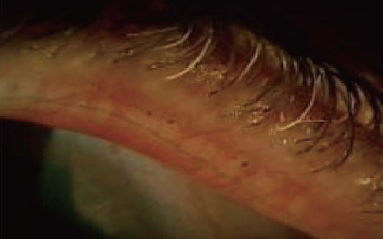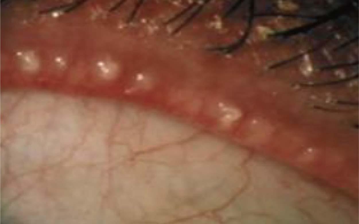 灼熱感、癢、溢淚、視覺品質下降、剛起床時眼皮沾黏、眼皮紅腫、睫毛四周出現皮屑並造成的刺癢及異物感。