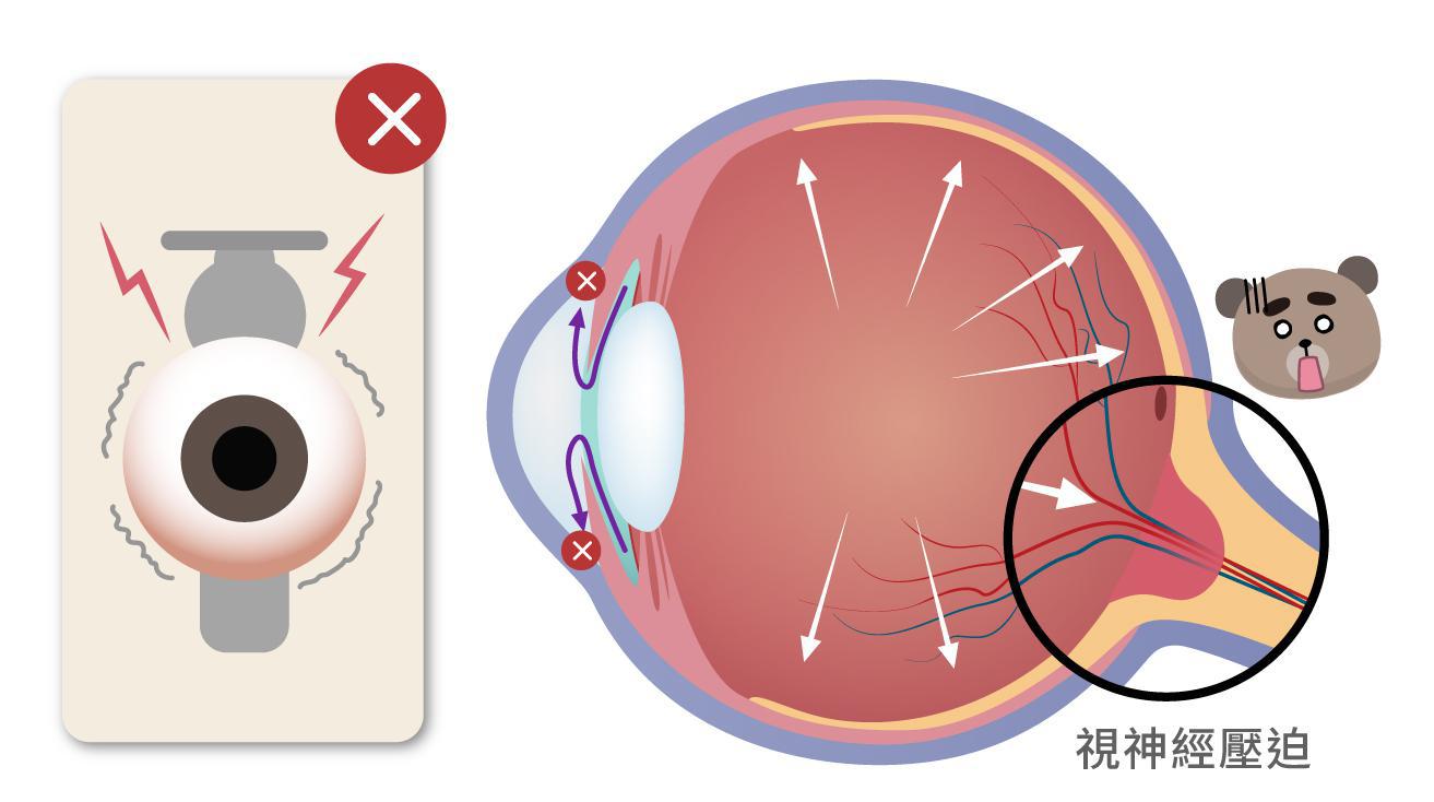 房水排出受到阻礙,造成過多的房水在眼球內部積蓄,就像水龍頭塞住排不出水,導致眼壓升高,進而壓迫到視神經,影響視覺。