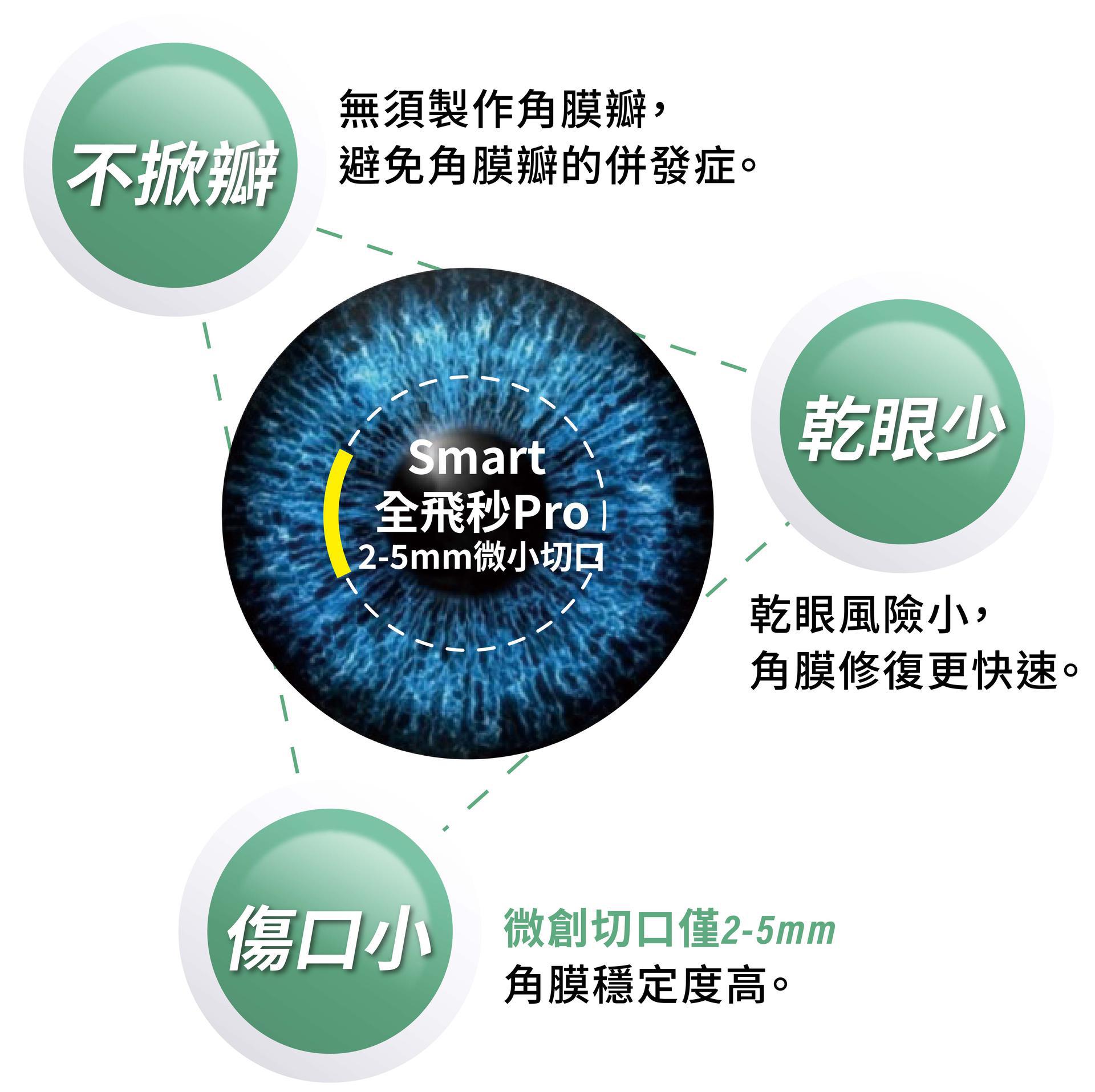 Smart 全飛秒 Pro(SmartSight)是獲得歐盟認證的角膜透鏡萃取手術(Refractive Corneal Lenticule Extraction),使用飛秒雷射在角膜內精準切出微透鏡後,再經由微創切口取出,達到屈光矯正的效果。