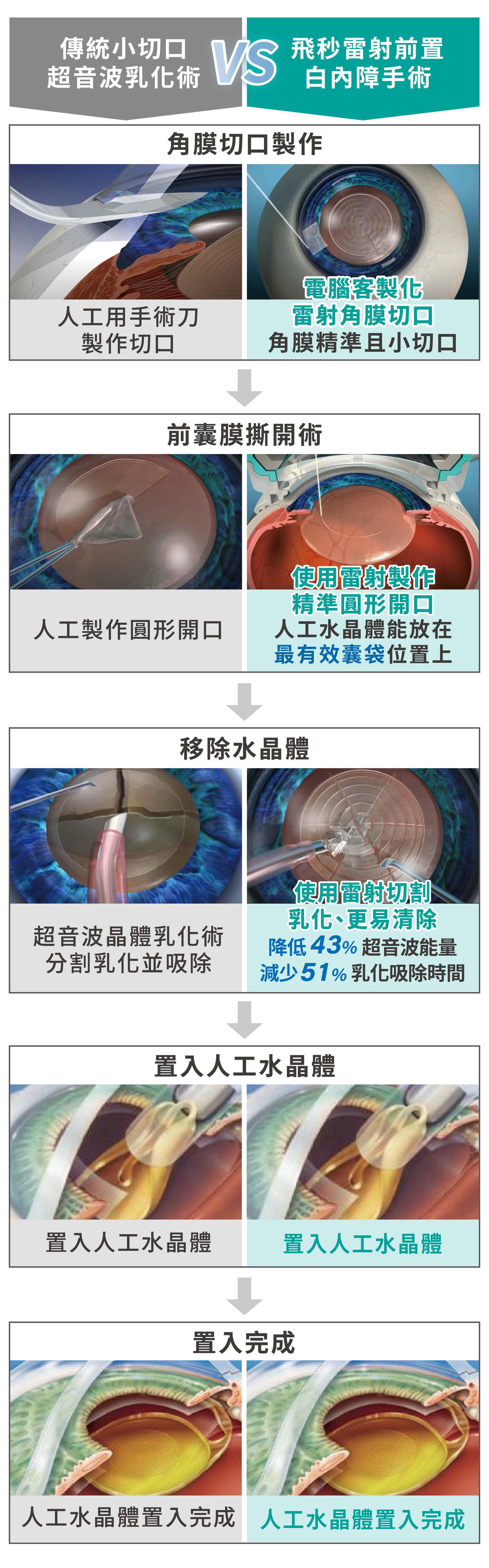 飛秒雷射是以高速脈衝對生物組織作切割,是現今高規格的技術,以飛秒雷射取代傳統人工器械,從製作角膜切口至分解硬化水晶體皆以飛秒雷射施作,再使用超音波晶體乳化儀,將分解的晶體吸出,放入人工水晶體。
