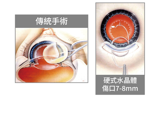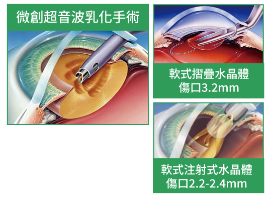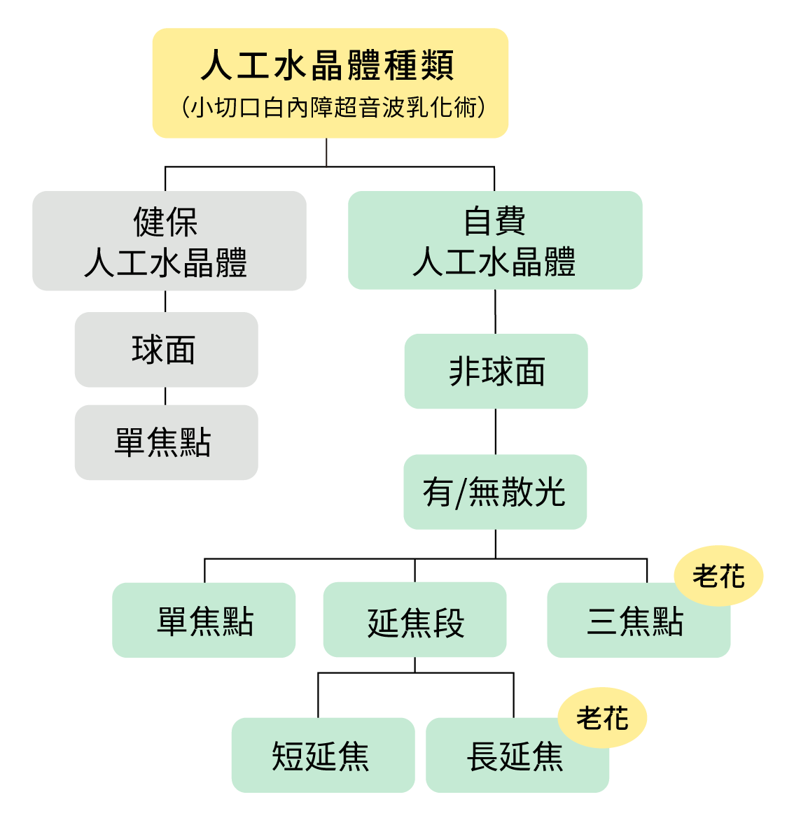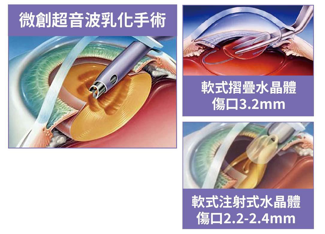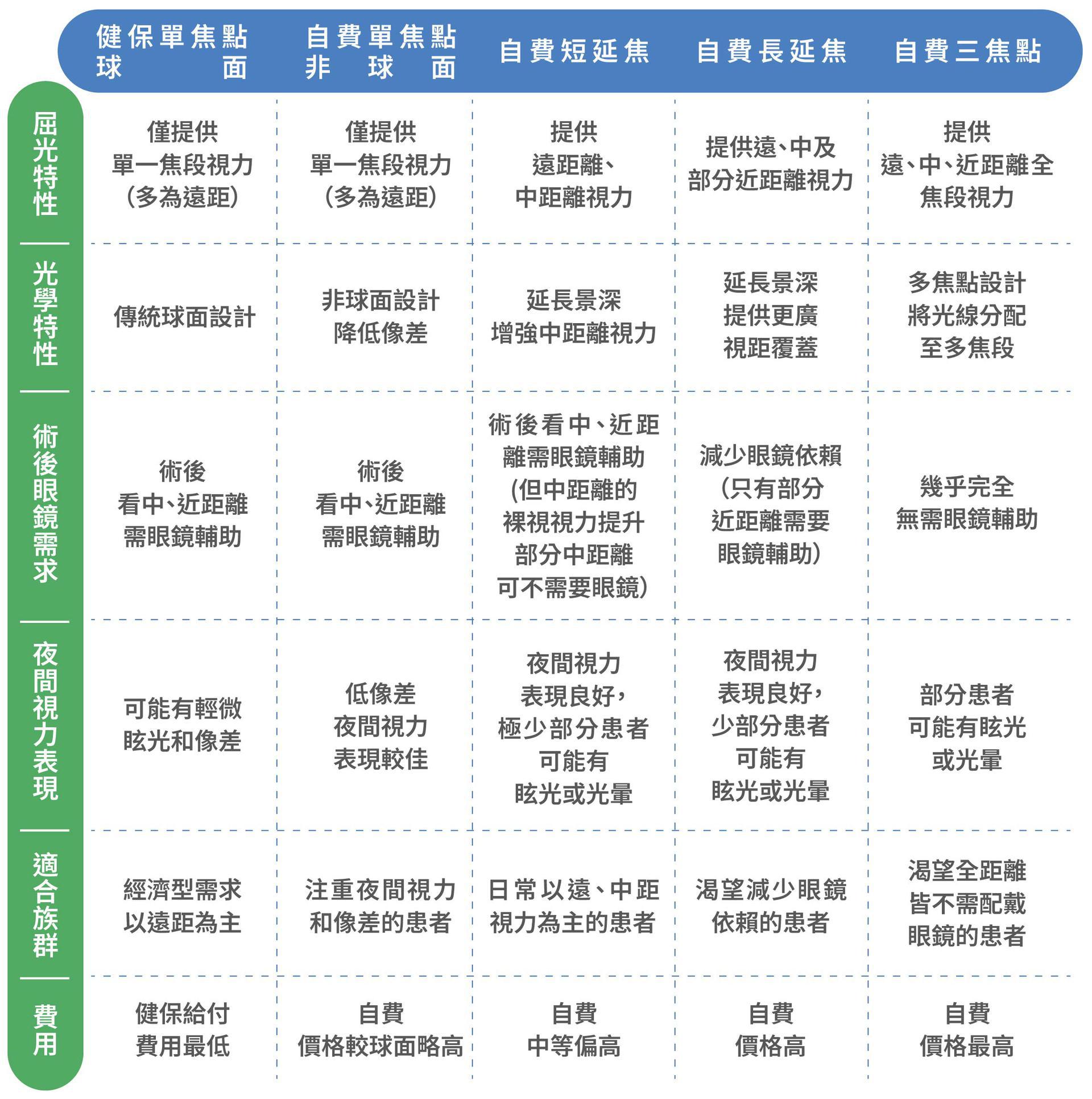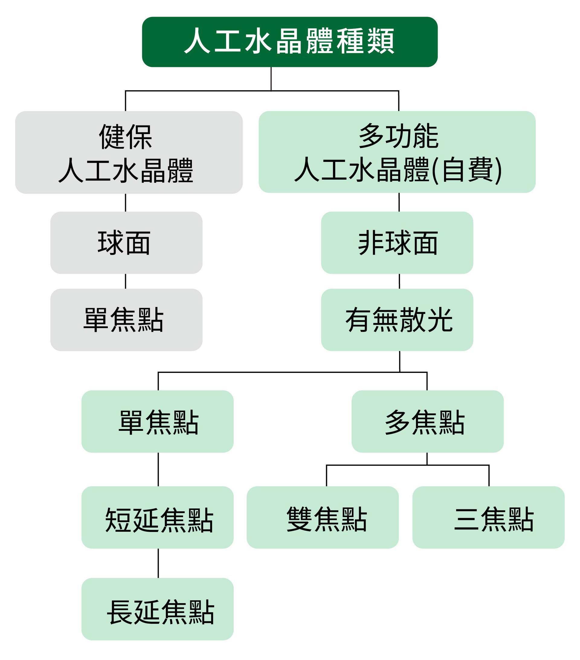 當使用超音波乳化術移除白內障後,就像幫相機換鏡頭一樣,必須置入人工水晶體,視力才會回復正常,因此依照個人需求選擇人工水晶體,非常重要。人工水晶體可分為單焦點水晶體、延焦段水晶體、三焦點水晶體,其中又可再區分為是否加上矯正散光或濾藍光的功能。在手術前,患者應該分析自己的用眼習慣,評估自己需要看遠(開車、騎車)、看中距離(電腦、切菜、打麻將)、看近(手機、書本、報紙)等等,是否需要夜間開車,根據自身需求輔以多項術前檢查的數據評估,與眼科醫師溝通後,才能選擇最適合自己的人工水晶體。