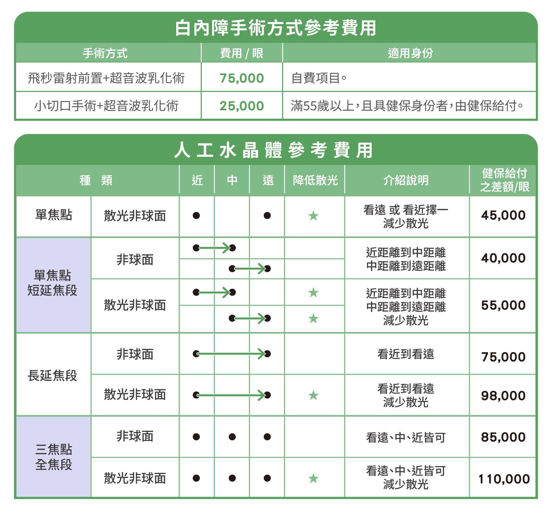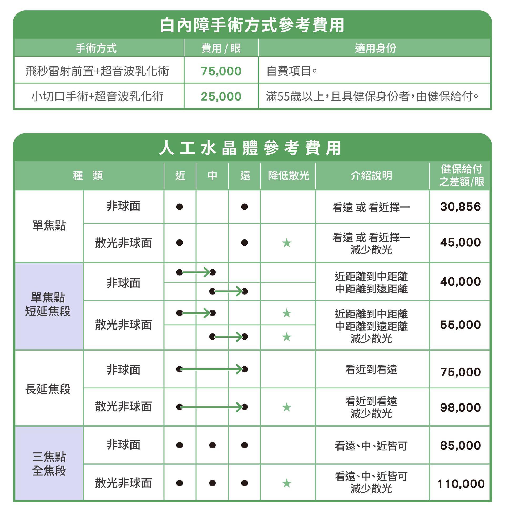 | 小切口手術 + 超音波乳化術 | 25,000 | 滿55歲以上,且具健保身份者,由健保給付。 |