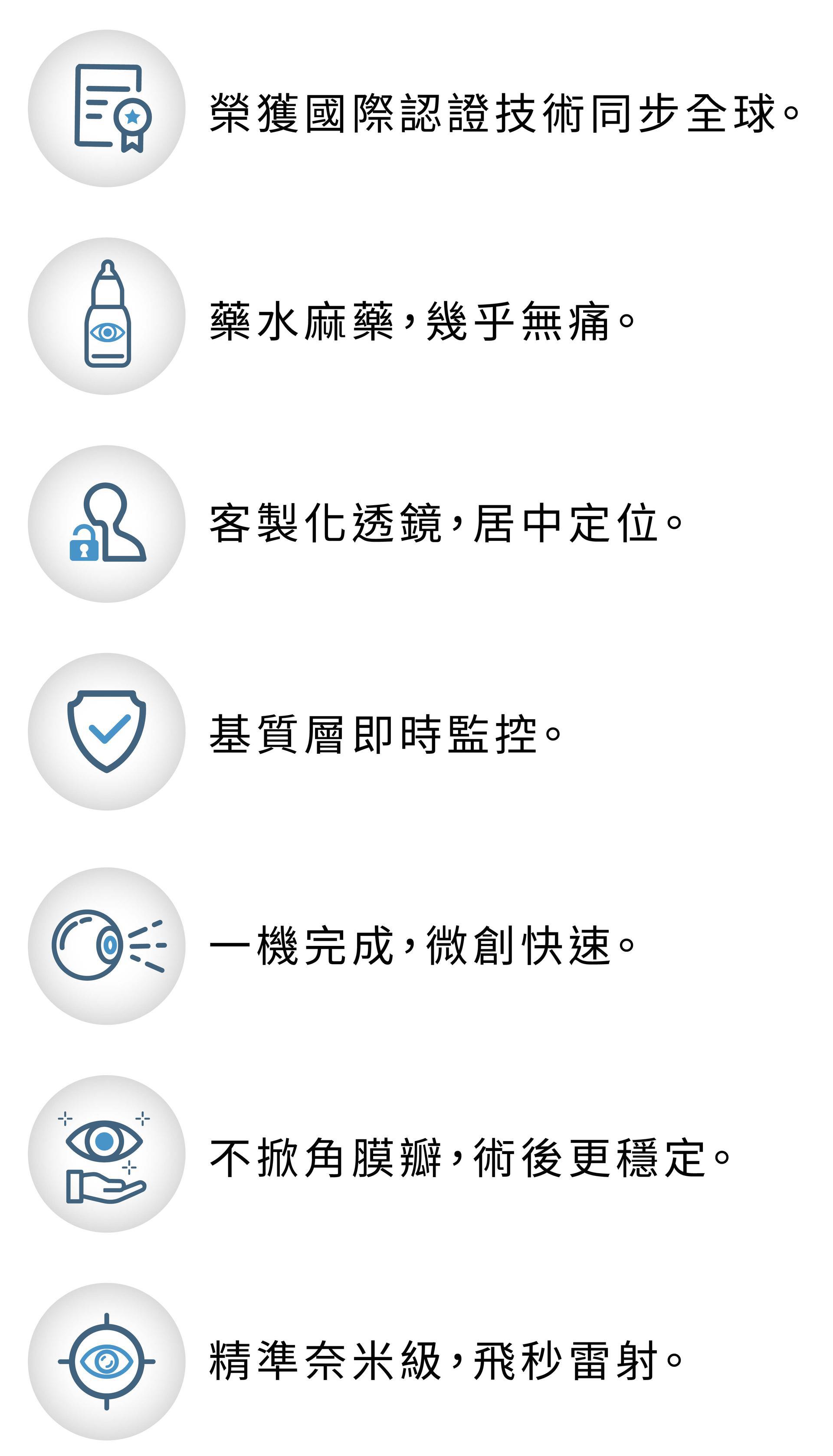 奈米級小分子、低熱能、高頻率的奈焦飛秒,因為熱能較低,搭配高頻率雷射速度,可在避免雷射造成角膜熱傷害的同時,有效率的完成透鏡製作,減少角膜皮質細胞損傷、降低角膜發炎,縮短術後恢復期與水霧感。