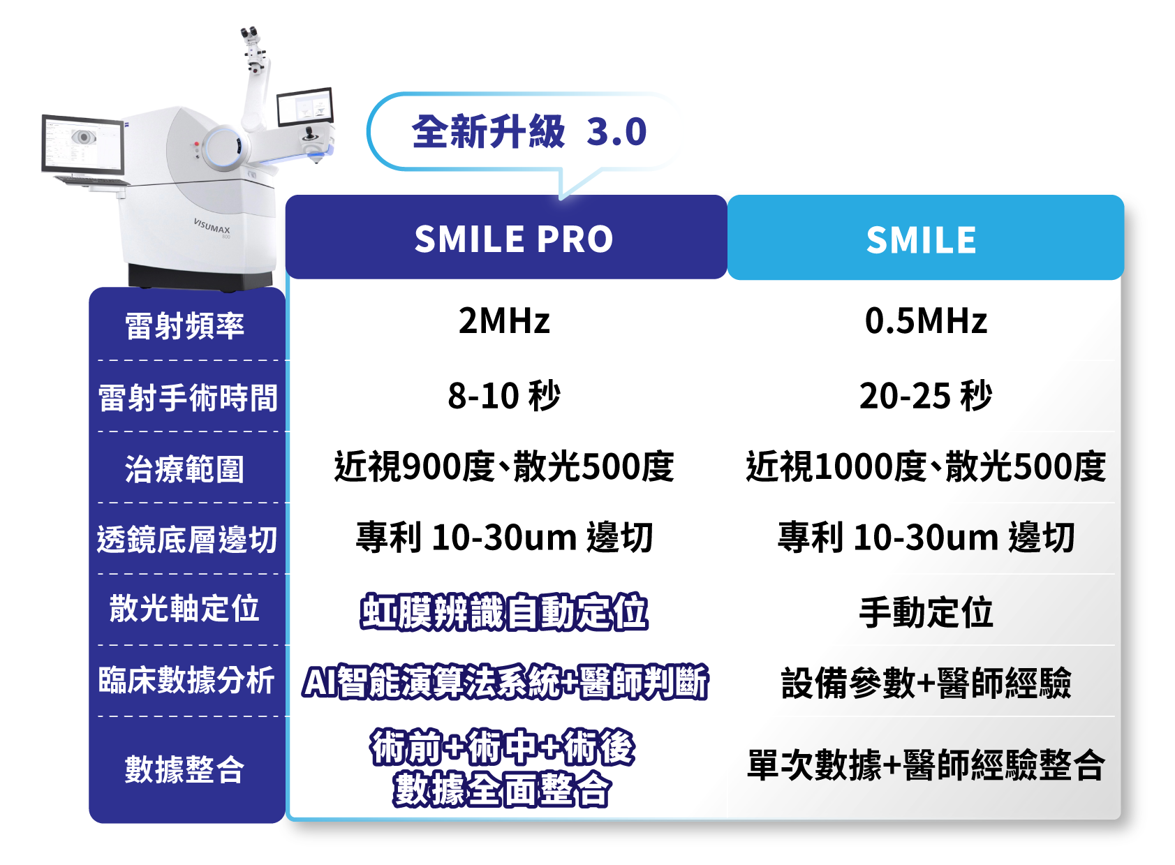 2026年SMILE Pro AI導航近視雷射迎來重大突破,在既有測量、定位、手術的「三大精準導航」基礎上,正式升級進化成 『會思考、會學習』的視力矯正平台,全新結合VISULYZE AI演算系統,並導入獨有的台灣雷射實證參數,可以讓平台深度學習,更能讀懂術前與術後「個人驗光數據」的精密關聯,透過AI預判並全面優化「金三角視力數據─解析度、清晰度、 銳利度」,實現精準客製化。
