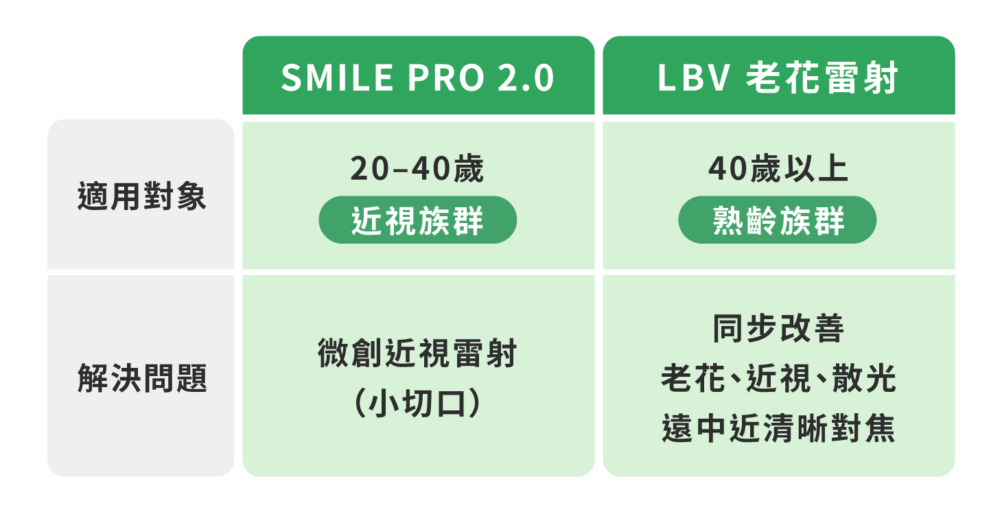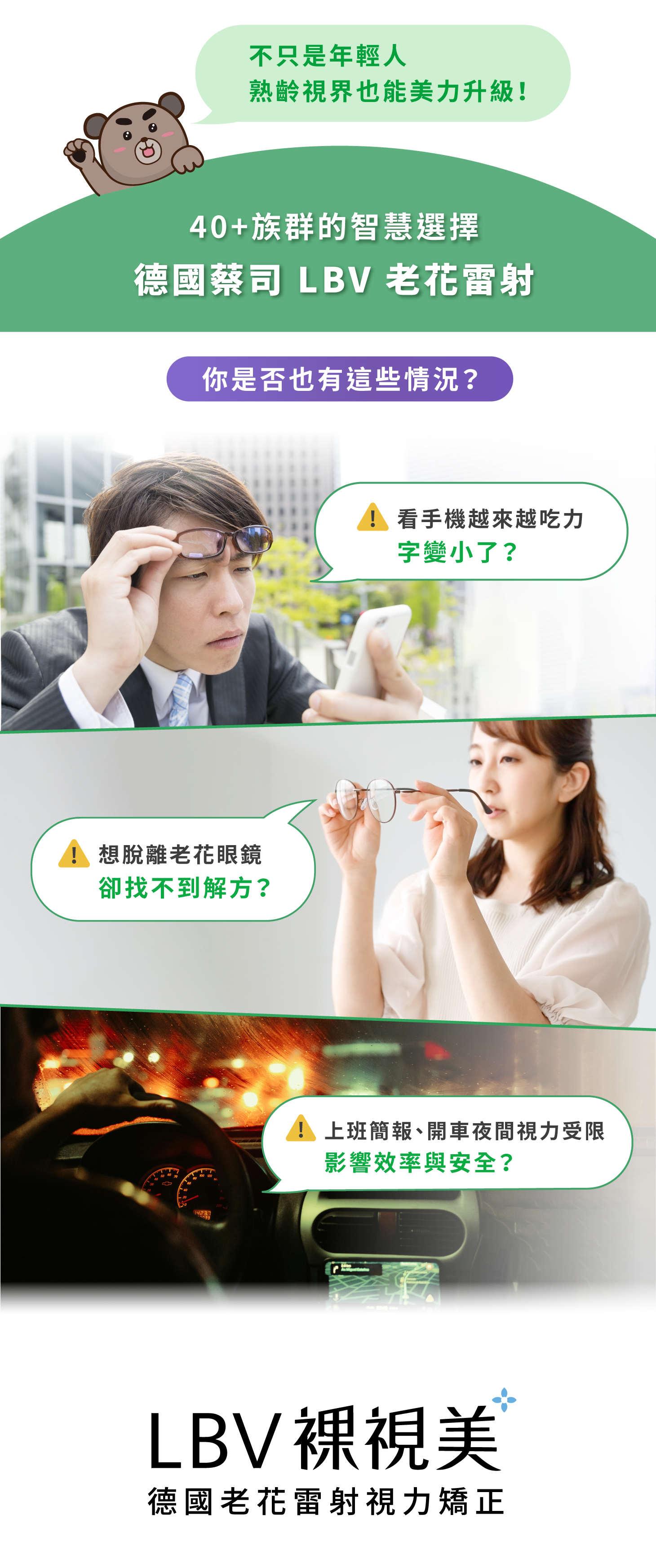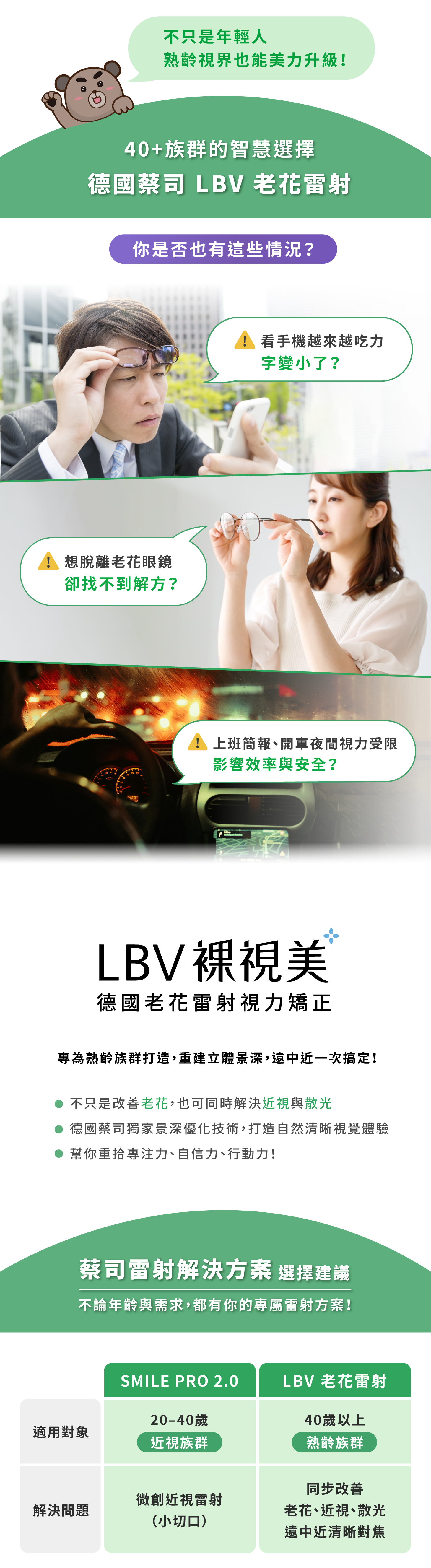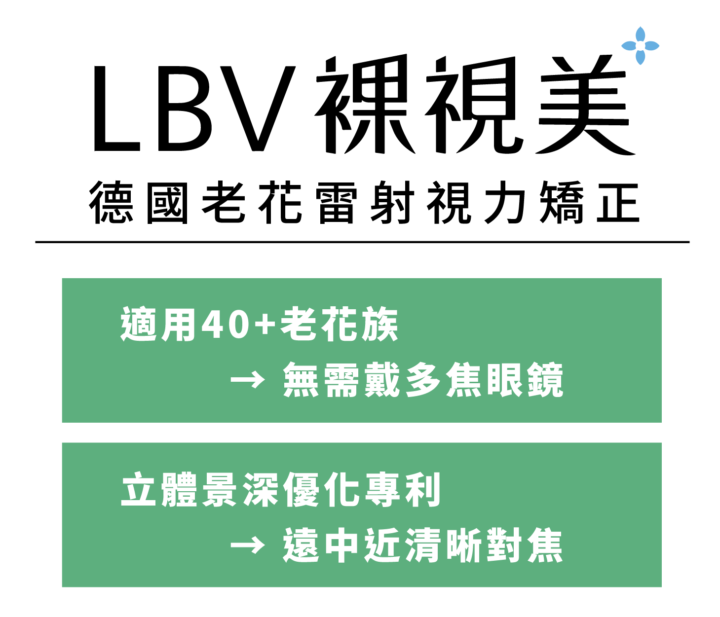 LBV 老花雷射採用 30 年技術成熟的 LASIK 飛秒近視雷射流程為基礎,結合精準光學設計,突破傳統老花雷射限制。適用於40歲以上的熟齡族群,同步改善老花、近視、散光,遠中近距離都能清晰對焦。