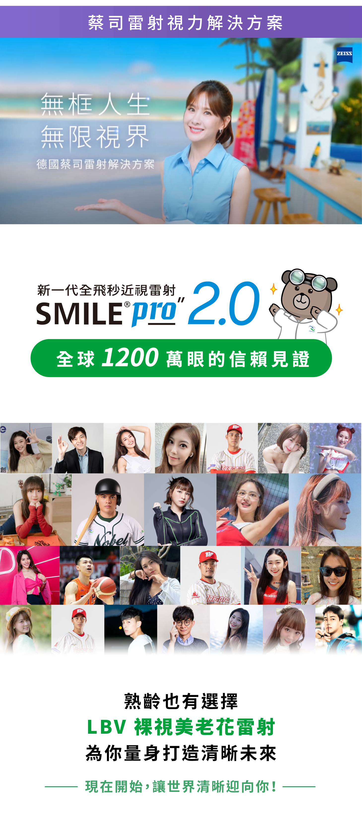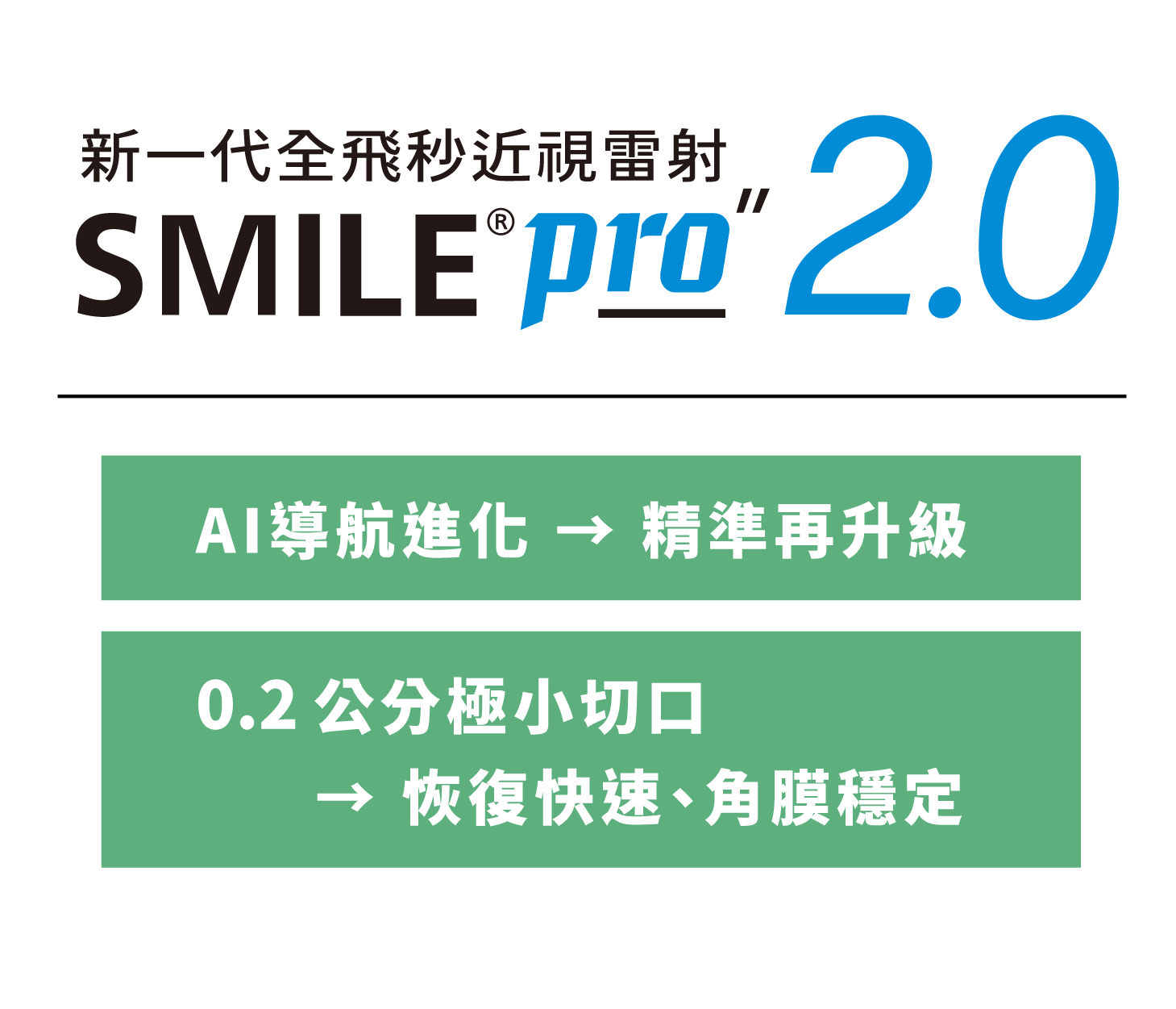 全新一代 SMILE Pro 2.0 微創全飛秒近視雷射,具備更低雷射能量傷害、更短的手術時間,結合AI智慧輔助功能,提升手術的精準度與術後恢復速度。 適用於20-40歲的近視族群,單眼8-10秒,手術一機完成。