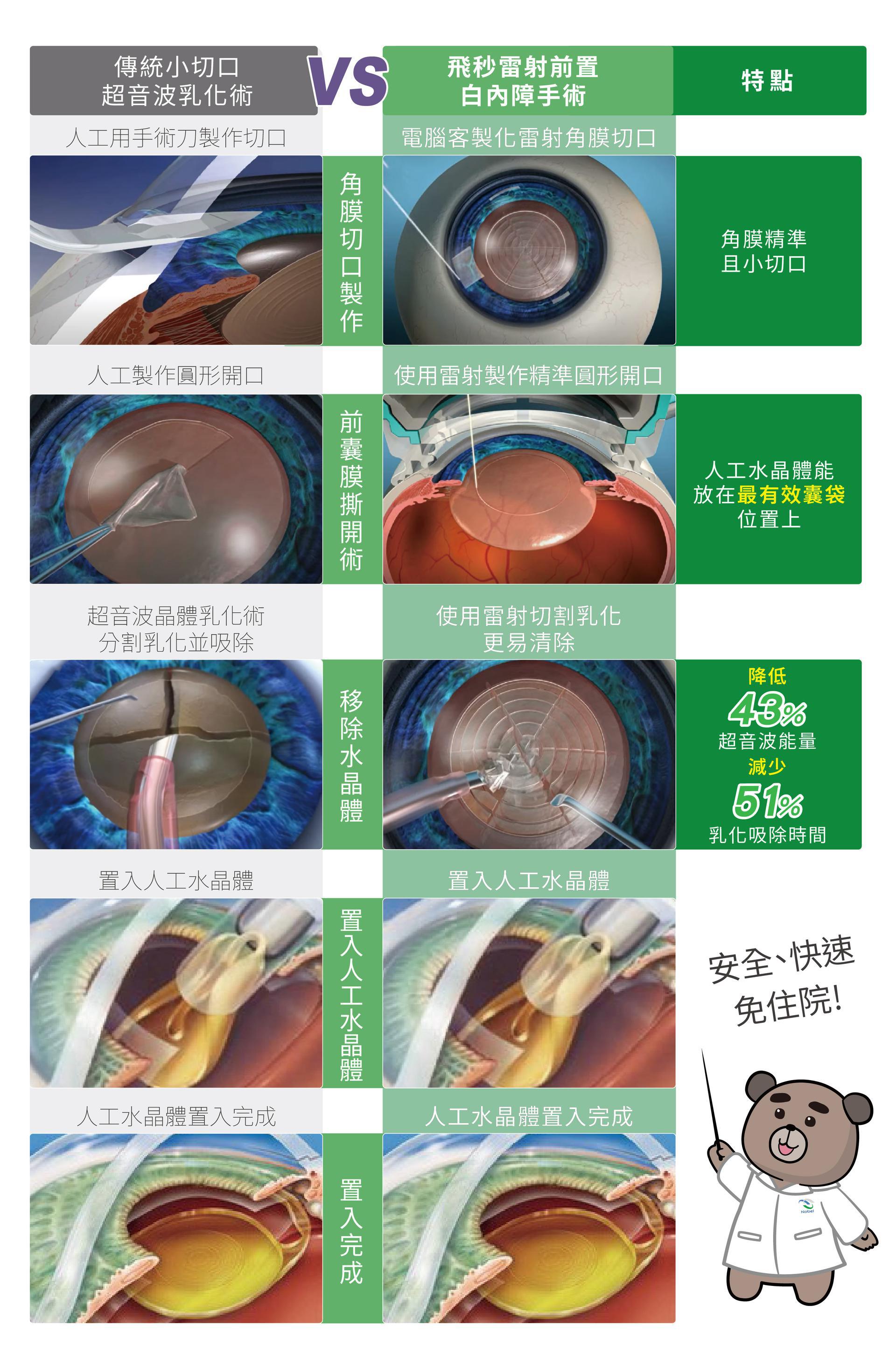 飛秒白內障手術則運用奈焦飛秒雷射高精準度的特性,確保角膜傷口製作較小、前囊袋撕除時無人工失誤、水晶體分割更細小等,讓後續人工水晶體的放置能更加穩定與置中,還可同步矯正部分散光。且減少超音波能量使用有助減少角膜傷害,更為安全。