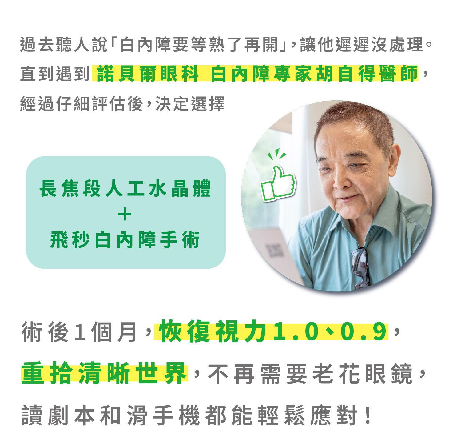 經過胡自得醫師仔細詢問了解小亮哥對於工作與生活上的視覺需求後,建議採用長焦段人工水晶體,並搭配飛秒白內障前置手術。感到非常放心!